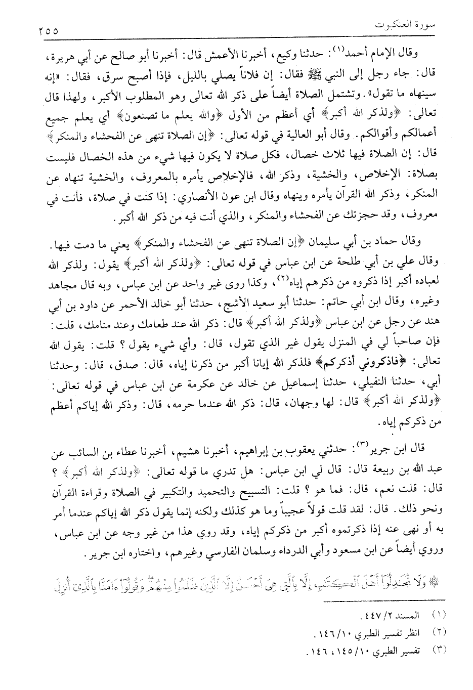 وقال الإمام أحمد «1» : حدثنا وكيع، أخبرنا الأعمش قال: أخبرنا أَبُو صَالِحٍ عَنْ أَبِي هُرَيْرَةَ، قَالَ: جَاءَ رَجُلٌ إِلَى النَّبِيِّ صَلَّى اللَّهُ عَلَيْهِ وَسَلَّمَ فَقَالَ: إِنَّ فُلَانًا يُصَلِّي بِاللَّيْلِ، فَإِذَا أَصْبَحَ سرق، فقال: «إنه سينهاه ما تقول» . وَتَشْتَمِلُ الصَّلَاةُ أَيْضًا عَلَى ذِكْرِ اللَّهِ تَعَالَى وَهُوَ الْمَطْلُوبُ الْأَكْبَرُ، وَلِهَذَا قَالَ تَعَالَى: وَلَذِكْرُ اللَّهِ أَكْبَرُ أَيْ أَعْظَمُ مِنَ الْأَوَّلِ وَاللَّهُ يَعْلَمُ ما تَصْنَعُونَ أي يعلم جميع أعمالكم وأقوالكم. وقال أبو العالية في قوله تعالى: إِنَّ الصَّلاةَ تَنْهى عَنِ الْفَحْشاءِ وَالْمُنْكَرِ قَالَ: إِنَّ الصَّلَاةَ فِيهَا ثَلَاثُ خِصَالٍ، فَكُلُّ صَلَاةٍ لا يكون فيها شيء من هذه الخصال فَلَيْسَتْ بِصَلَاةٍ: الْإِخْلَاصُ، وَالْخَشْيَةُ، وَذِكْرُ اللَّهِ، فَالْإِخْلَاصُ يَأْمُرُهُ بِالْمَعْرُوفِ، وَالْخَشْيَةُ تَنْهَاهُ عَنِ الْمُنْكَرِ، وَذِكْرُ الله الْقُرْآنِ يَأْمُرُهُ وَيَنْهَاهُ وَقَالَ ابْنُ عَوْنٍ الْأَنْصَارِيُّ: إِذَا كُنْتَ فِي صَلَاةٍ، فَأَنْتَ فِي مَعْرُوفٍ، وَقَدْ حَجَزَتْكَ عَنِ الْفَحْشَاءِ وَالْمُنْكَرِ، وَالَّذِي أَنْتَ فِيهِ مِنْ ذِكْرِ اللَّهِ أَكْبَرُ.