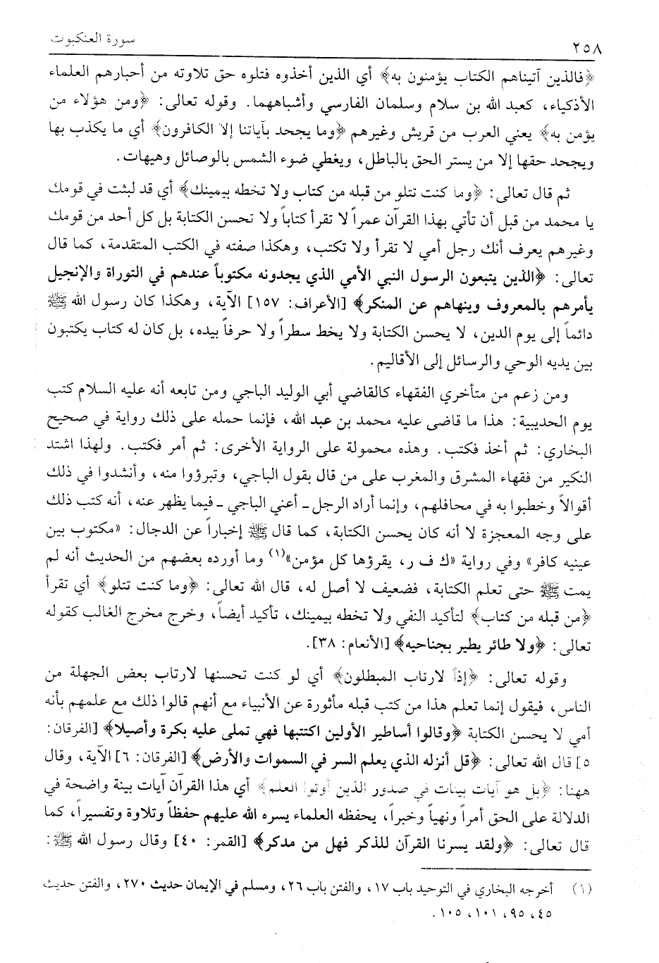 وَمَنْ زَعَمَ مِنْ مُتَأَخَّرِي الْفُقَهَاءِ كَالْقَاضِي أَبِي الْوَلِيدِ الْبَاجِيِّ وَمَنْ تَابَعَهُ أَنَّهُ عَلَيْهِ السَّلَامُ كَتَبَ يَوْمَ الْحُدَيْبِيَةِ: هَذَا مَا قَاضَى عَلَيْهِ مُحَمَّدُ بْنُ عَبْدِ اللَّهِ، فَإِنَّمَا حَمَلَهُ عَلَى ذَلِكَ رِوَايَةٌ فِي صَحِيحِ الْبُخَارِيِّ: ثُمَّ أَخَذَ فَكَتَبَ. وَهَذِهِ مَحْمُولَةٌ عَلَى الرِّوَايَةِ الْأُخْرَى: ثُمَّ أَمَرَ فكتب. ولهذا اشتد النكير من فقهاء المشرق والمغرب على من قال بقول الباجي، وتبرؤوا مِنْهُ، وَأَنْشَدُوا فِي ذَلِكَ أَقْوَالًا وَخَطَبُوا بِهِ فِي مَحَافِلِهِمْ، وَإِنَّمَا أَرَادَ الرَّجُلُ- أَعْنِي الْبَاجِيَّ- فِيمَا يَظْهَرُ عَنْهُ، أَنَّهُ كَتَبَ ذَلِكَ عَلَى وَجْهِ الْمُعْجِزَةِ لَا أَنَّهُ كَانَ يُحْسِنُ الْكِتَابَةَ، كما قال صلى الله عليه وسلم إِخْبَارًا عَنِ الدَّجَّالِ: «مَكْتُوبٌ بَيْنَ عَيْنَيْهِ كَافِرٌ» وَفِي رِوَايَةٍ «ك ف ر، يَقْرَؤُهَا كُلُّ مُؤْمِنٍ» «1» وَمَا أَوْرَدَهُ بَعْضُهُمْ مِنَ الْحَدِيثِ أَنَّهُ لم يمت صلى الله عليه وسلم حَتَّى تَعَلَّمَ الْكِتَابَةَ، فَضَعِيفٌ لَا أَصْلَ لَهُ، قال الله تعالى: وَما كُنْتَ تَتْلُوا أَيْ تَقْرَأُ مِنْ قَبْلِهِ مِنْ كِتابٍ لِتَأْكِيدِ النَّفْيِ وَلَا تَخُطُّهُ بِيَمِينِكَ، تَأْكِيدٌ أَيْضًا، وَخَرَجَ مَخْرَجَ الْغَالِبِ كَقَوْلِهِ تَعَالَى: وَلا طائِرٍ يَطِيرُ بِجَناحَيْهِ [الأنعام: 38] .