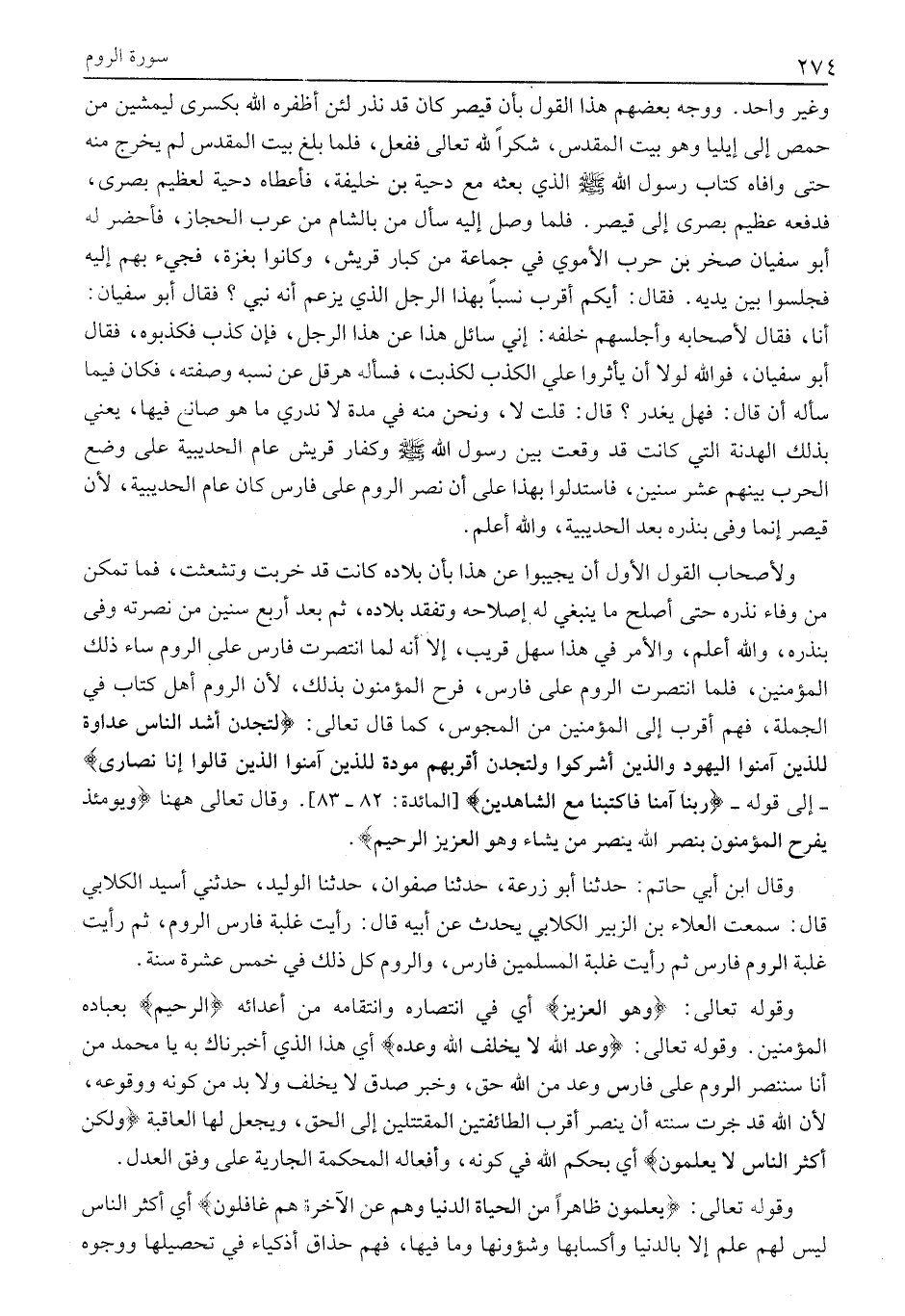 أَنَا، فَقَالَ لِأَصْحَابِهِ وَأَجْلَسَهُمْ خَلْفَهُ: إِنِّي سَائِلٌ هَذَا عَنْ هَذَا الرَّجُلِ، فَإِنْ كَذَبَ فَكَذِّبُوهُ، فَقَالَ أَبُو سفيان، فو الله لَوْلَا أَنْ يَأْثُرُوا عَلَيَّ الْكَذِبَ لَكَذَبْتُ، فَسَأَلَهُ هِرَقْلُ عَنْ نَسَبِهِ وَصِفَتِهِ، فَكَانَ فِيمَا سَأَلَهُ أَنْ قَالَ: فَهَلْ يَغْدِرُ؟ قَالَ: قُلْتُ لَا، وَنَحْنُ مِنْهُ فِي مُدَّةٍ لَا نَدْرِي مَا هُوَ صَانِعٌ فِيهَا، يَعْنِي بِذَلِكَ الْهُدْنَةَ الَّتِي كَانَتْ قَدْ وَقَعَتْ بَيْنَ رَسُولِ اللَّهِ صَلَّى اللَّهُ عَلَيْهِ وَسَلَّمَ وكفار قريش عام الْحُدَيْبِيَةِ عَلَى وَضْعِ الْحَرْبِ بَيْنَهُمْ عَشْرَ سِنِينَ، فَاسْتَدَلُّوا بِهَذَا عَلَى أَنَّ نَصْرَ الرُّومِ عَلَى فَارِسَ كَانَ عَامَ الْحُدَيْبِيَةِ، لِأَنَّ قَيْصَرَ إِنَّمَا وَفَّى بِنَذْرِهِ بَعْدَ الْحُدَيْبِيَةِ، وَاللَّهُ أَعْلَمُ.