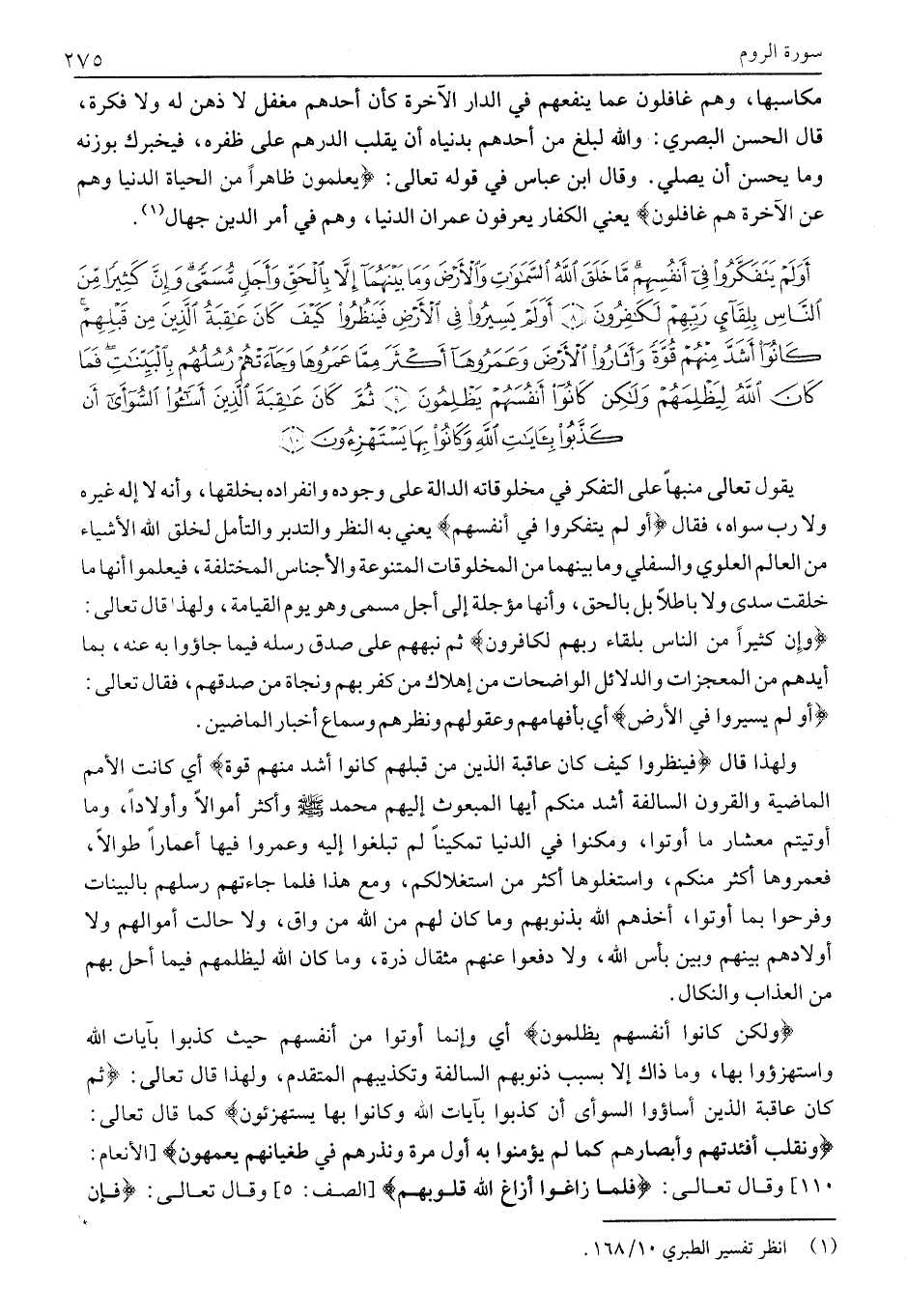 أَوَلَمْ يَتَفَكَّرُوا فِي أَنْفُسِهِمْ مَا خَلَقَ اللَّهُ السَّماواتِ وَالْأَرْضَ وَما بَيْنَهُما إِلاَّ بِالْحَقِّ وَأَجَلٍ مُسَمًّى وَإِنَّ كَثِيراً مِنَ النَّاسِ بِلِقاءِ رَبِّهِمْ لَكافِرُونَ (8) أَوَلَمْ يَسِيرُوا فِي الْأَرْضِ فَيَنْظُرُوا كَيْفَ كانَ عاقِبَةُ الَّذِينَ مِنْ قَبْلِهِمْ كانُوا أَشَدَّ مِنْهُمْ قُوَّةً وَأَثارُوا الْأَرْضَ وَعَمَرُوها أَكْثَرَ مِمَّا عَمَرُوها وَجاءَتْهُمْ رُسُلُهُمْ بِالْبَيِّناتِ فَما كانَ اللَّهُ لِيَظْلِمَهُمْ وَلكِنْ كانُوا أَنْفُسَهُمْ يَظْلِمُونَ (9) ثُمَّ كانَ عاقِبَةَ الَّذِينَ أَساؤُا السُّواى أَنْ كَذَّبُوا بِآياتِ اللَّهِ وَكانُوا بِها يَسْتَهْزِؤُنَ (10)