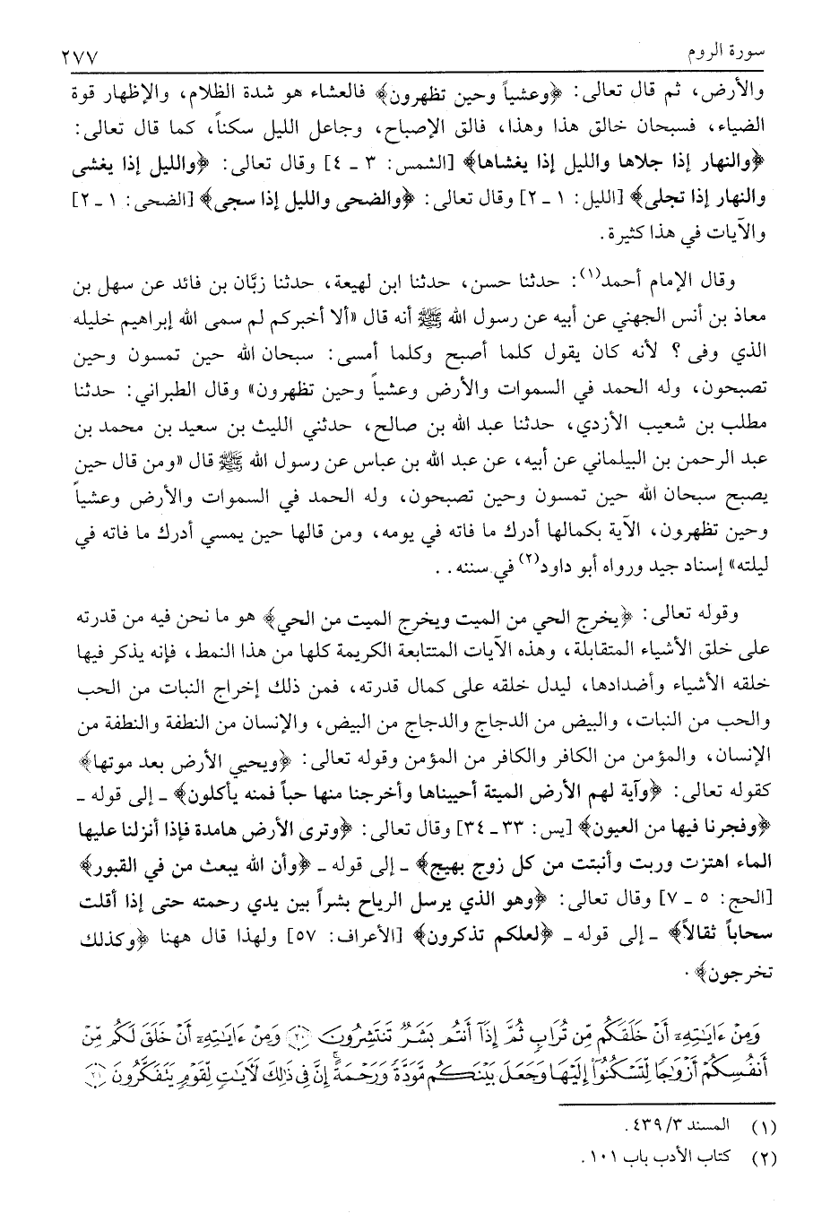 وَقَالَ الْإِمَامُ أَحْمَدُ «1» : حَدَّثَنَا حَسَنٌ، حَدَّثَنَا ابْنُ لَهِيعَةَ، حَدَّثَنَا زَبَّانَ بْنِ فَائِدٍ عَنْ سَهْلِ بْنِ مُعَاذِ بْنِ أَنَسٍ الْجُهَنِيِّ عَنْ أَبِيهِ عَنْ رَسُولِ اللَّهِ صَلَّى اللَّهُ عَلَيْهِ وَسَلَّمَ أَنَّهُ قَالَ «أَلَا أُخْبِرُكُمْ لِمَ سَمَّى اللَّهُ إِبْرَاهِيمَ خَلِيلَهُ الَّذِي وَفَّى؟ لِأَنَّهُ كَانَ يَقُولُ كُلَّمَا أَصْبَحَ وَكُلَّمَا أَمْسَى: سُبْحَانَ اللَّهِ حِينَ تَمَسُّونَ وَحِينَ تُصْبِحُونَ، وَلَهُ الحمد في السموات وَالْأَرْضِ وَعَشِيًّا وَحِينَ تُظْهِرُونَ» وَقَالَ الطَّبَرَانِيُّ: حَدَّثَنَا مُطَّلِبُ بْنُ شُعَيْبٍ الْأَزْدِيُّ، حَدَّثَنَا عَبْدُ اللَّهِ بن صالح، حدثني الليث بن سعيد بن محمد بن عبد الرحمن بن البيلماني عن أَبِيهِ، عَنْ عَبْدِ اللَّهِ بْنِ عَبَّاسٍ عَنْ رَسُولِ اللَّهِ صَلَّى اللَّهُ عَلَيْهِ وَسَلَّمَ قال «ومن قال حين يصبح سُبْحَانَ اللَّهِ حِينَ تَمَسُّونَ وَحِينَ تُصْبِحُونَ، وَلَهُ الحمد في السموات وَالْأَرْضِ وَعَشِيًّا وَحِينَ تُظْهِرُونَ، الْآيَةَ بِكَمَالِهَا أَدْرَكَ مَا فَاتَهُ فِي يَوْمِهِ، وَمَنْ قَالَهَا حِينَ يُمْسِي أَدْرَكَ مَا فَاتَهُ فِي لَيْلَتِهِ» إِسْنَادٌ جَيِّدٌ وَرَوَاهُ أَبُو دَاوُدَ «2» فِي سُنَنِهِ.