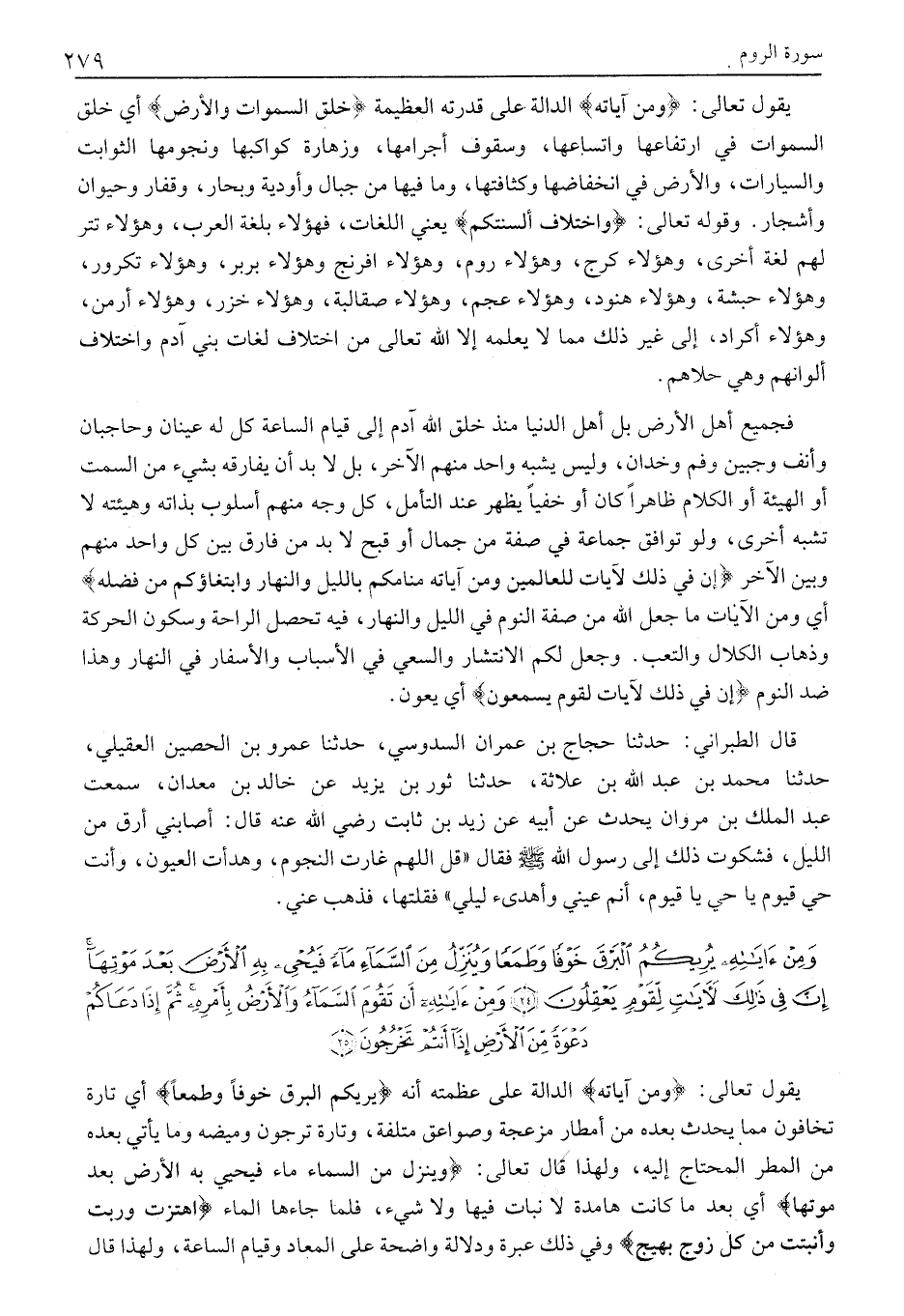 فَجَمِيعُ أَهْلِ الْأَرْضِ بَلْ أَهْلِ الدُّنْيَا مُنْذُ خَلَقَ اللَّهُ آدَمَ إِلَى قِيَامِ السَّاعَةِ كُلٌّ لَهُ عَيْنَانِ وَحَاجِبَانِ وَأَنْفٌ وَجَبِينٌ وَفَمٌ وَخَدَّانِ، وَلَيْسَ يُشْبِهُ وَاحِدٌ مِنْهُمُ الْآخَرَ، بَلْ لَا بُدَّ أَنْ يُفَارِقَهُ بِشَيْءٍ مِنَ السَّمْتِ أَوِ الْهَيْئَةِ أَوِ الْكَلَامِ ظَاهِرًا كَانَ أَوْ خَفِيًّا يَظْهَرُ عِنْدَ التَّأَمُّلِ، كُلُّ وَجْهٍ منهم أسلوب بذاته وهيئته لا تشبه أخرى، وَلَوْ تَوَافَقَ جَمَاعَةٌ فِي صِفَةٍ مِنْ جَمَالٍ أَوْ قُبْحٍ لَا بُدَّ مِنْ فَارِقٍ بَيْنَ كُلِّ وَاحِدٍ مِنْهُمْ وَبَيْنَ الْآخَرِ إِنَّ فِي ذلِكَ لَآياتٍ لِلْعالِمِينَ وَمِنْ آياتِهِ مَنامُكُمْ بِاللَّيْلِ وَالنَّهارِ وَابْتِغاؤُكُمْ مِنْ فَضْلِهِ أَيْ وَمِنِ الْآيَاتِ ما جعل الله مِنْ صِفَةِ النُّوَّمِ فِي اللَّيْلِ وَالنَّهَارِ، فِيهِ تَحْصُلُ الرَّاحَةُ وَسُكُونُ الْحَرَكَةِ وَذَهَابُ الْكَلَالِ وَالتَّعَبِ. وَجَعَلَ لَكُمْ الِانْتِشَارَ وَالسَّعْيَ فِي الْأَسْبَابِ وَالْأَسْفَارِ فِي النَّهَارِ وَهَذَا ضِدُّ النَّوْمِ إِنَّ فِي ذلِكَ لَآياتٍ لِقَوْمٍ يَسْمَعُونَ أَيْ يَعُونَ.