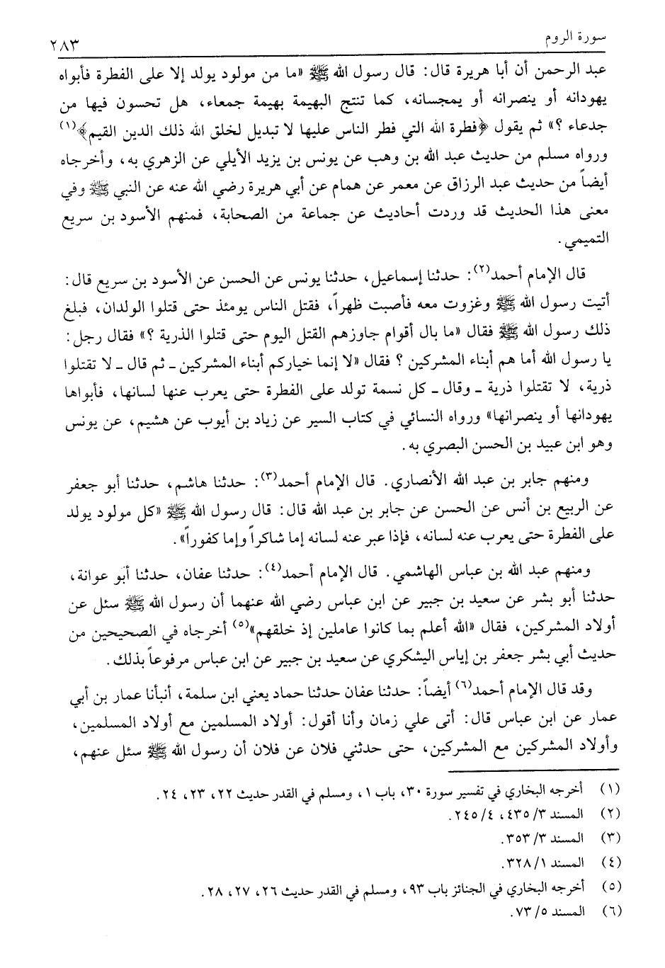 عَبْدِ الرَّحْمَنِ أَنَّ أَبَا هُرَيْرَةَ قَالَ: قَالَ رَسُولُ اللَّهِ صَلَّى اللَّهُ عَلَيْهِ وَسَلَّمَ «مَا مِنْ مَوْلُودٍ يُولَدُ إِلَّا عَلَى الْفِطْرَةِ فَأَبَوَاهُ يُهَوِّدَانِهِ أَوْ يُنَصِّرَانِهِ أَوْ يُمَجِّسَانِهِ، كَمَا تُنْتِجُ الْبَهِيمَةُ بَهِيمَةً جَمْعَاءَ، هَلْ تُحِسُّونَ فِيهَا مِنْ جدعاء؟» ثم يقول فِطْرَتَ اللَّهِ الَّتِي فَطَرَ النَّاسَ عَلَيْها لَا تَبْدِيلَ لِخَلْقِ اللَّهِ ذلِكَ الدِّينُ الْقَيِّمُ «1» وَرَوَاهُ مُسْلِمٌ مِنْ حَدِيثِ عَبْدِ اللَّهِ بْنِ وَهْبٍ عَنْ يُونُسَ بْنِ يَزِيدَ الْأَيْلِيِّ عَنِ الزُّهْرِيِّ بِهِ، وَأَخْرَجَاهُ أَيْضًا مِنْ حَدِيثِ عَبْدِ الرَّزَّاقِ عَنْ مَعْمَرٍ عَنْ هَمَّامٍ عَنْ أَبِي هُرَيْرَةَ رَضِيَ اللَّهُ عَنْهُ عَنِ النَّبِيِّ صَلَّى اللَّهُ عَلَيْهِ وَسَلَّمَ وَفِي مَعْنَى هَذَا الْحَدِيثِ قَدْ وَرَدَتْ أَحَادِيثُ عَنْ جَمَاعَةٍ مِنَ الصَّحَابَةِ، فَمِنْهُمُ الْأَسْوَدُ بْنُ سَرِيعٍ التَّمِيمِيُّ.