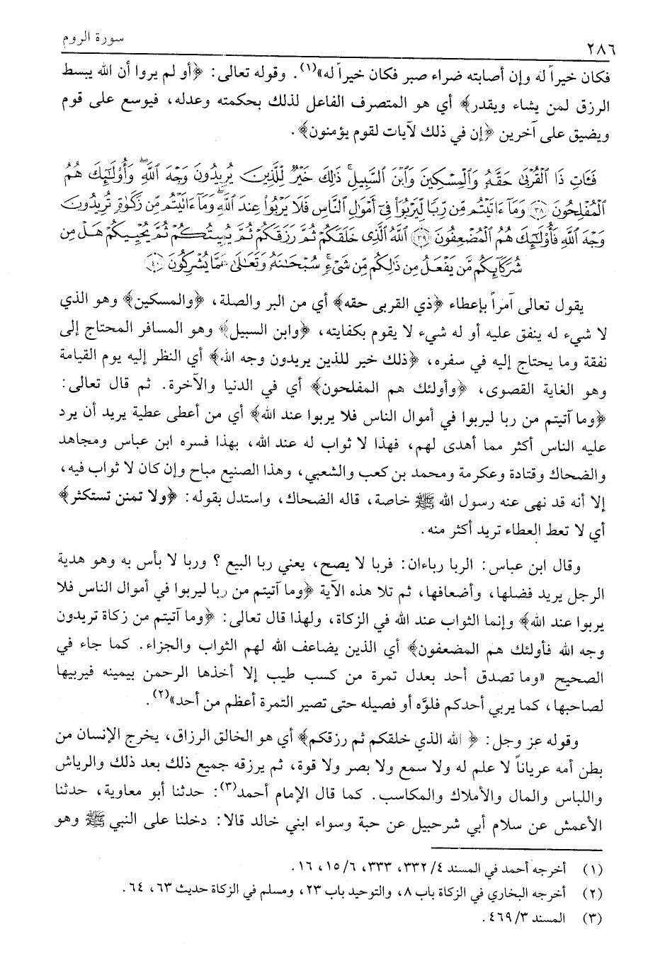 فَآتِ ذَا الْقُرْبى حَقَّهُ وَالْمِسْكِينَ وَابْنَ السَّبِيلِ ذلِكَ خَيْرٌ لِلَّذِينَ يُرِيدُونَ وَجْهَ اللَّهِ وَأُولئِكَ هُمُ الْمُفْلِحُونَ (38) وَما آتَيْتُمْ مِنْ رِباً لِيَرْبُوَا فِي أَمْوالِ النَّاسِ فَلا يَرْبُوا عِنْدَ اللَّهِ وَما آتَيْتُمْ مِنْ زَكاةٍ تُرِيدُونَ وَجْهَ اللَّهِ فَأُولئِكَ هُمُ الْمُضْعِفُونَ (39) اللَّهُ الَّذِي خَلَقَكُمْ ثُمَّ رَزَقَكُمْ ثُمَّ يُمِيتُكُمْ ثُمَّ يُحْيِيكُمْ هَلْ مِنْ شُرَكائِكُمْ مَنْ يَفْعَلُ مِنْ ذلِكُمْ مِنْ شَيْءٍ سُبْحانَهُ وَتَعالى عَمَّا يُشْرِكُونَ (40)