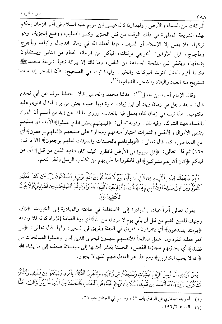 الْبَرَكَاتِ مِنَ السَّمَاءِ وَالْأَرْضِ. وَلِهَذَا إِذَا نَزَلَ عِيسَى ابْنُ مَرْيَمَ عَلَيْهِ السَّلَامُ فِي آخِرِ الزمان يحكم بِهَذِهِ الشَّرِيعَةِ الْمُطَهَّرَةِ فِي ذَلِكَ الْوَقْتِ مِنْ قَتْلِ الْخِنْزِيرِ وَكَسْرِ الصَّلِيبِ وَوَضْعِ الْجِزْيَةِ، وَهُوَ تَرْكُهَا، فَلَا يَقْبَلُ إِلَّا الْإِسْلَامَ أَوِ السَّيْفَ، فَإِذَا أَهْلَكَ اللَّهُ فِي زَمَانِهِ الدَّجَّالَ وَأَتْبَاعَهُ ويأجوج ومأجوج، قيل للأرض: أخرجي بركتك، فَيَأْكُلُ مِنَ الرُّمَّانَةِ الْفِئَامُ مِنَ النَّاسِ وَيَسْتَظِلُّونَ بِقَحْفِهَا، وَيَكْفِي لَبَنُ اللِّقْحَةِ الْجَمَاعَةَ مِنَ النَّاسِ، وما ذاك إلا ببركة تنفيذ شريعة محمد صَلَّى اللَّهُ عَلَيْهِ وَسَلَّمَ فَكُلَّمَا أُقِيمَ الْعَدْلُ كَثُرَتِ الْبَرَكَاتُ وَالْخَيْرُ. وَلِهَذَا ثَبَتَ فِي الصَّحِيحِ: «إِنَّ الْفَاجِرَ إِذَا مَاتَ تَسْتَرِيحُ مِنْهُ الْعِبَادُ والبلاد والشجر والدواب» «1» .