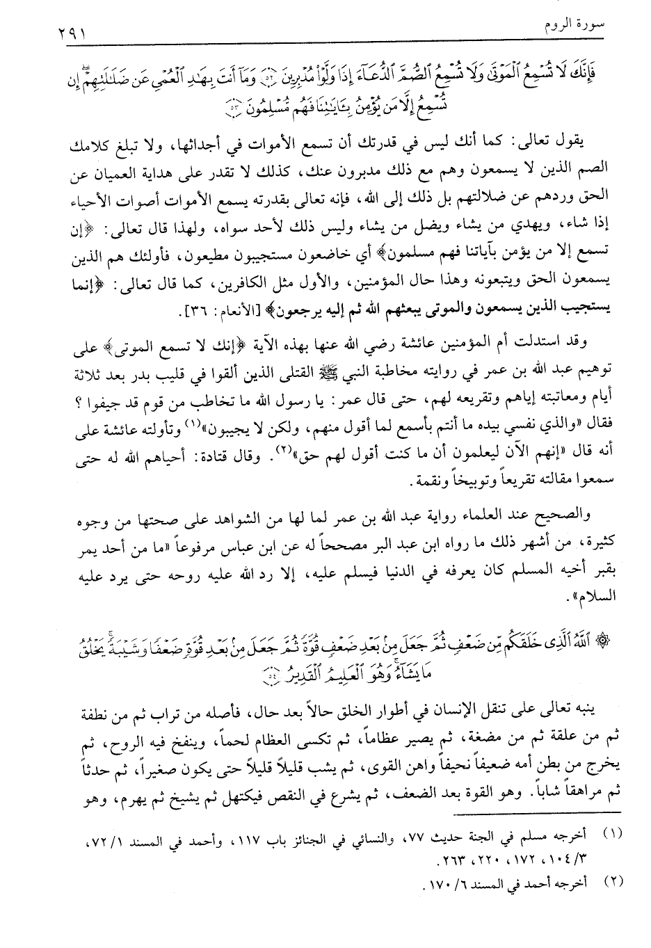 وَقَدِ اسْتَدَلَّتْ أُمُّ الْمُؤْمِنِينَ عَائِشَةُ رَضِيَ الله عنها بهذه الآية فَإِنَّكَ لَا تُسْمِعُ الْمَوْتى عَلَى تَوْهِيمِ عَبْدِ اللَّهِ بْنِ عُمَرَ فِي رِوَايَتِهِ مُخَاطَبَةَ النَّبِيِّ صَلَّى اللَّهُ عَلَيْهِ وَسَلَّمَ الْقَتْلَى الَّذِينَ أُلْقُوا فِي قَلِيبِ بَدْرٍ بَعْدَ ثَلَاثَةِ أَيَّامٍ وَمُعَاتَبَتَهُ إِيَّاهُمْ وتقريعه لهم، حتى قال عُمَرُ: يَا رَسُولَ اللَّهِ مَا تُخَاطِبُ مِنْ قَوْمٍ قَدْ جُيِّفُوا؟