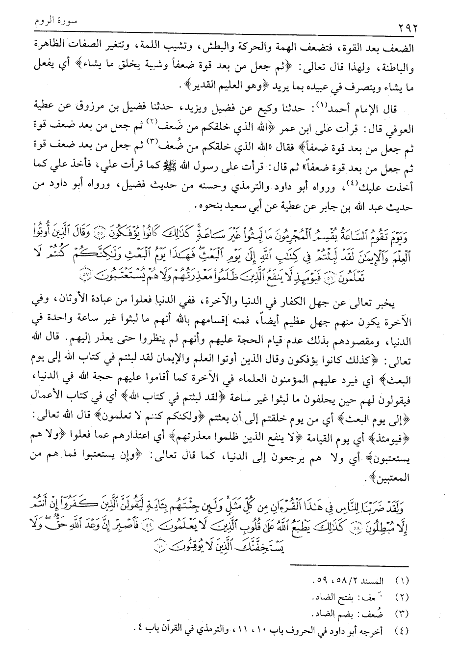 : حَدَّثَنَا وَكِيعٌ عَنْ فُضَيْلٍ وَيَزِيدَ، حَدَّثَنَا فُضَيْلُ بْنُ مَرْزُوقٍ عَنْ عَطِيَّةَ الْعَوْفِيِّ قَالَ: قَرَأْتُ عَلَى ابْنِ عُمَرَ اللَّهُ الَّذِي خَلَقَكُمْ مِنْ ضَعْفٍ «2» ثُمَّ جَعَلَ مِنْ بَعْدِ ضَعْفٍ قُوَّةً ثُمَّ جَعَلَ مِنْ بَعْدِ قُوَّةٍ ضَعْفاً فَقَالَ «اللَّهُ الَّذِي خَلَقَكُمْ مِنْ ضَعْفٍ «3» ثُمَّ جَعَلَ مِنْ بَعْدِ ضَعْفٍ قُوَّةً ثُمَّ جَعَلَ مِنْ بَعْدِ قُوَّةٍ ضَعْفًا» ثُمَّ قَالَ: قَرَأْتُ عَلَى رَسُولِ اللَّهِ صَلَّى اللَّهُ عَلَيْهِ وَسَلَّمَ كَمَا قَرَأْتَ عَلَيَّ، فَأَخَذَ عَلَيَّ كَمَا أَخَذْتُ عَلَيْكَ «4» ، وَرَوَاهُ أَبُو دَاوُدَ والترمذي وحسنه من حديث فضيل، وَرَوَاهُ أَبُو دَاوُدَ مِنْ حَدِيثِ عَبْدِ اللَّهِ بْنِ جَابِرٍ عَنْ عَطِيَّةَ عَنْ أَبِي سَعِيدٍ بنحوه.