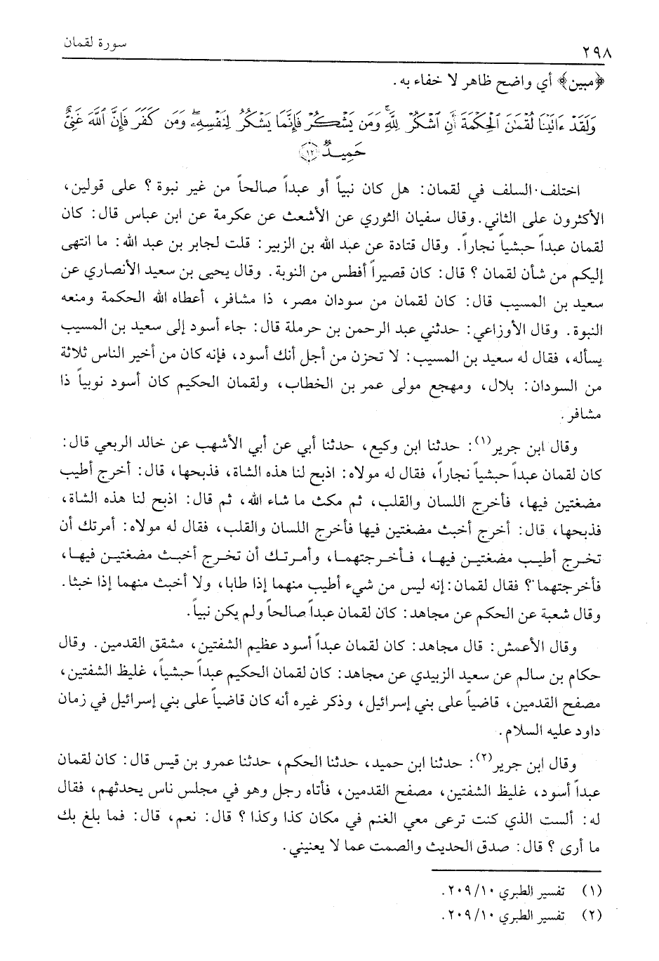 اخْتَلَفَ السَّلَفُ فِي لقمان: هَلْ كَانَ نَبِيًّا أَوْ عَبْدًا صَالِحًا مِنْ غَيْرِ نُبُوَّةٍ؟ عَلَى قَوْلَيْنِ، الْأَكْثَرُونَ عَلَى الثَّانِي. وَقَالَ سُفْيَانُ الثَّوْرِيُّ عَنِ الْأَشْعَثِ عَنْ عِكْرِمَةَ عَنِ ابْنِ عَبَّاسٍ قَالَ: كَانَ لُقْمَانُ عَبْدًا حَبَشِيًّا نَجَّارًا. وَقَالَ قَتَادَةُ عَنْ عَبْدِ اللَّهِ بْنِ الزُّبَيْرِ: قُلْتُ لِجَابِرِ بْنِ عَبْدِ اللَّهِ: مَا انْتَهَى إِلَيْكُمْ مِنْ شَأْنِ لُقْمَانَ؟ قَالَ: كَانَ قَصِيرًا أَفْطَسَ مِنَ النُّوبَةِ. وَقَالَ يَحْيَى بْنُ سَعِيدٍ الْأَنْصَارِيُّ عَنْ سَعِيدِ بْنِ الْمُسَيَّبِ قَالَ: كَانَ لُقْمَانُ مِنْ سُودَانِ مِصْرَ، ذَا مَشَافِرَ، أَعْطَاهُ اللَّهُ الْحِكْمَةَ وَمَنَعَهُ النُّبُوَّةَ. وَقَالَ الأوزاعي: حَدَّثَنِي عَبْدُ الرَّحْمَنِ بْنُ حَرْمَلَةَ قَالَ: جَاءَ أَسْوَدُ إِلَى سَعِيدِ بْنِ الْمُسَيَّبِ يَسْأَلُهُ، فَقَالَ لَهُ سَعِيدُ بْنُ الْمُسَيَّبِ: لَا تَحْزَنْ مِنْ أَجْلِ أَنَّكَ أَسْوَدَ، فَإِنَّهُ كَانَ مِنْ أَخْيَرِ النَّاسِ ثَلَاثَةٌ مِنَ السُّودَانِ: بِلَالٌ، وَمَهْجَعٌ مَوْلَى عُمَرَ بْنِ الْخَطَّابِ، وَلُقْمَانُ الْحَكِيمُ كَانَ أَسْوَدَ نُوبِيًّا ذَا مَشَافِرَ.
