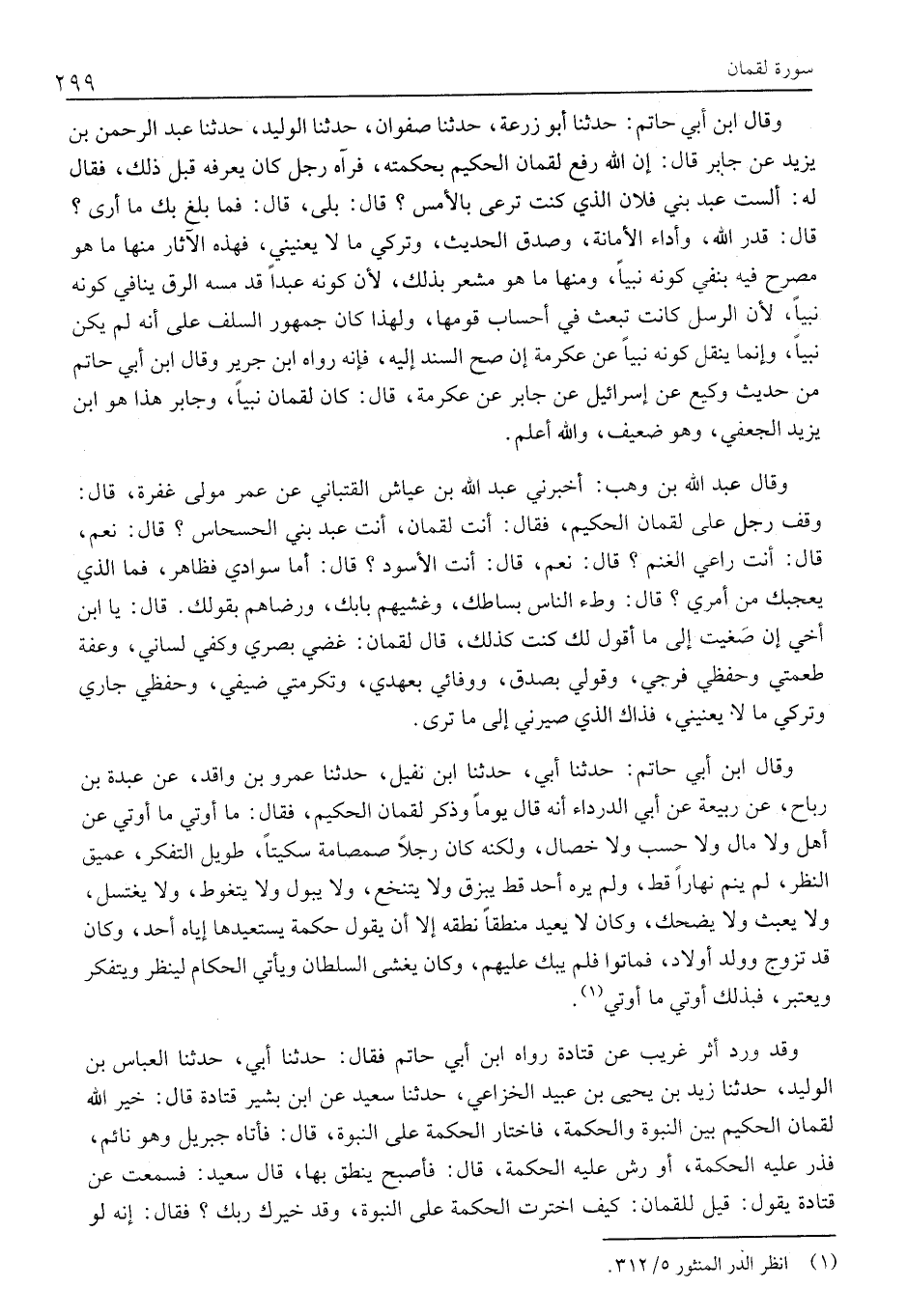 قَالَ: قَدَرُ اللَّهِ، وَأَدَاءُ الْأَمَانَةِ، وَصِدْقُ الْحَدِيثِ، وَتَرْكِي مَا لَا يَعْنِينِي، فَهَذِهِ الْآثَارُ مِنْهَا مَا هُوَ مُصَرَّحٌ فِيهِ بِنَفْيِ كَوْنِهِ نَبِيًّا، وَمِنْهَا مَا هُوَ مُشْعِرٌ بِذَلِكَ، لِأَنَّ كَوْنَهُ عَبْدًا قَدْ مَسَّهُ الرِّقُّ يُنَافِي كَوْنَهُ نَبِيًّا، لِأَنَّ الرُّسُلَ كَانَتْ تُبْعَثُ فِي أَحْسَابِ قَوْمِهَا، وَلِهَذَا كَانَ جُمْهُورُ السَّلَفِ عَلَى أَنَّهُ لَمْ يَكُنْ نَبِيًّا، وَإِنَّمَا يُنْقَلُ كَوْنُهُ نَبِيًّا عَنْ عِكْرِمَةَ إِنْ صَحَّ السَّنَدُ إِلَيْهِ، فَإِنَّهُ رَوَاهُ ابْنُ جَرِيرٍ وَقَالَ ابْنُ أَبِي حَاتِمٍ مِنْ حَدِيثِ وَكِيعٍ عَنْ إِسْرَائِيلَ عن جابر عن عكرمة، قال: كَانَ لُقْمَانُ نَبِيًّا، وَجَابِرٌ هَذَا هُوَ ابْنُ يَزِيدَ الْجُعْفِيُّ، وَهُوَ ضَعِيفٌ، وَاللَّهُ أَعْلَمُ.