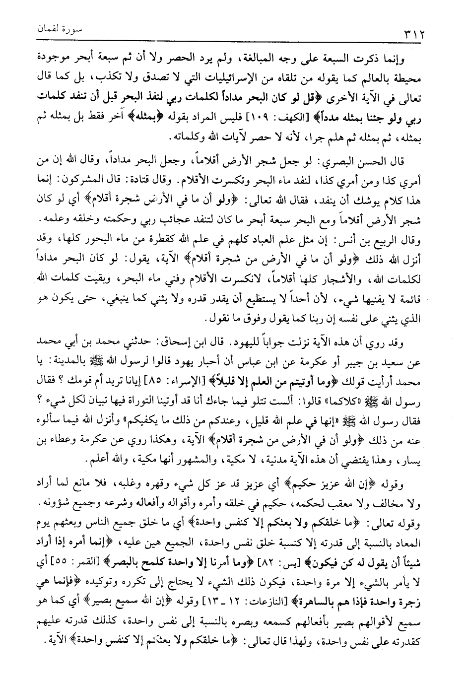 وَقَالَ الرَّبِيعُ بْنُ أَنَسٍ: إِنَّ مَثَلَ عِلْمِ الْعِبَادِ كُلِّهِمْ فِي عِلْمِ اللَّهِ كَقَطْرَةٍ مِنْ مَاءِ الْبُحُورِ كُلِّهَا، وَقَدْ أَنْزَلَ اللَّهُ ذَلِكَ وَلَوْ أَنَّما فِي الْأَرْضِ مِنْ شَجَرَةٍ أَقْلامٌ الْآيَةَ، يَقُولُ: لَوْ كَانَ الْبَحْرُ مِدَادًا لِكَلِمَاتِ اللَّهِ، وَالْأَشْجَارِ كُلُّهَا أَقْلَامًا، لَانْكَسَرَتِ الْأَقْلَامُ وَفَنِيَ مَاءُ الْبَحْرِ، وَبَقِيَتْ كَلِمَاتُ اللَّهِ قَائِمَةً لَا يُفْنِيهَا شَيْءٌ، لِأَنَّ أَحَدًا لَا يَسْتَطِيعُ أَنْ يَقْدُرَ قَدْرَهُ وَلَا يُثْنِيَ كَمَا يَنْبَغِي، حَتَّى يَكُونَ هُوَ الَّذِي يُثْنِي عَلَى نَفْسِهِ إِنَّ رَبَّنَا كَمَا يَقُولُ وَفَوْقَ مَا نَقُولُ.