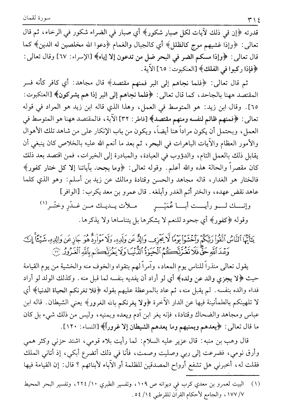 قُدْرَتِهِ إِنَّ فِي ذلِكَ لَآياتٍ لِكُلِّ صَبَّارٍ شَكُورٍ أَيْ صَبَّارٌ فِي الضَّرَّاءِ شَكُورٌ فِي الرخاء، ثم قال تعالى: وَإِذا غَشِيَهُمْ مَوْجٌ كَالظُّلَلِ أَيْ كَالْجِبَالِ وَالْغَمَامِ دَعَوُا اللَّهَ مُخْلِصِينَ لَهُ الدِّينَ كَمَا قَالَ تَعَالَى: وَإِذا مَسَّكُمُ الضُّرُّ فِي الْبَحْرِ ضَلَّ مَنْ تَدْعُونَ إِلَّا إِيَّاهُ [الْإِسْرَاءِ: 67] وَقَالَ تَعَالَى: