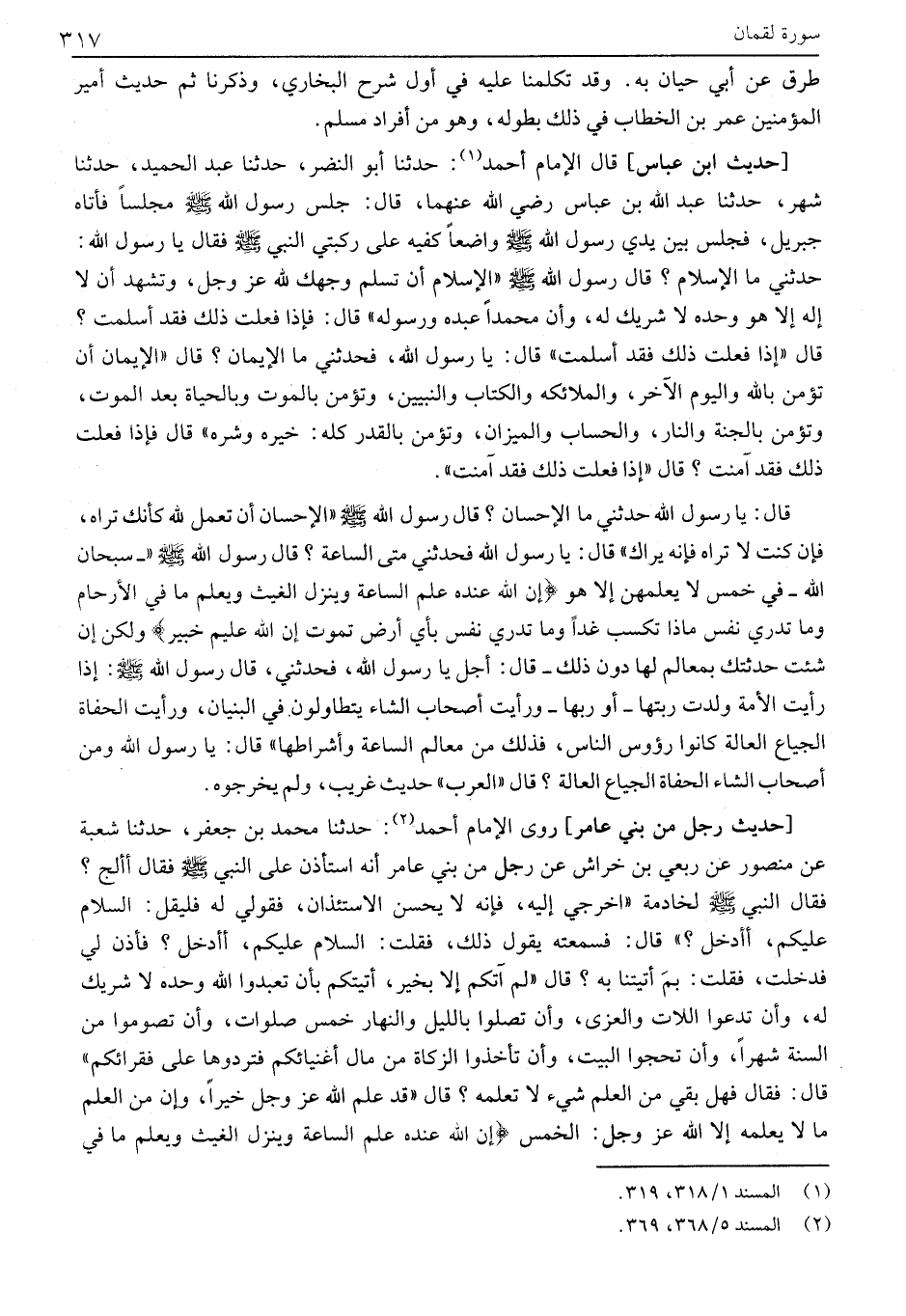 قَالَ: يَا رَسُولَ اللَّهِ حَدِّثْنِي مَا الْإِحْسَانُ؟ قَالَ رَسُولُ اللَّهِ صَلَّى اللَّهُ عَلَيْهِ وَسَلَّمَ «الْإِحْسَانُ أَنْ تَعْمَلَ لِلَّهِ كَأَنَّكَ تَرَاهُ، فَإِنْ كُنْتَ لَا تَرَاهُ فَإِنَّهُ يَرَاكَ» قَالَ: يَا رَسُولَ اللَّهِ فَحَدِّثْنِي مَتَى السَّاعَةُ؟ قَالَ رَسُولُ اللَّهِ صَلَّى اللَّهُ عَلَيْهِ وَسَلَّمَ «- سُبْحَانَ اللَّهِ- فِي خَمْسٍ لَا يَعْلَمُهُنَّ إِلَّا هُوَ إِنَّ اللَّهَ عِنْدَهُ عِلْمُ السَّاعَةِ وَيُنَزِّلُ الْغَيْثَ وَيَعْلَمُ مَا فِي الْأَرْحامِ وَما تَدْرِي نَفْسٌ مَاذَا تَكْسِبُ غَداً وَما تَدْرِي نَفْسٌ بِأَيِّ أَرْضٍ تَمُوتُ إِنَّ اللَّهَ عَلِيمٌ خَبِيرٌ وَلَكِنْ إِنْ شِئْتَ حَدَّثْتُكَ بِمَعَالِمَ لَهَا دُونَ ذَلِكَ- قَالَ: أَجَلْ يَا رَسُولَ اللَّهِ، فَحَدِّثْنِي، قَالَ رَسُولُ اللَّهِ صَلَّى اللَّهُ عَلَيْهِ وَسَلَّمَ: إذا رَأَيْتَ الْأَمَةَ وَلَدَتْ رَبَّتَهَا- أَوْ رَبَّهَا- وَرَأَيْتَ أَصْحَابَ الشَّاءِ يَتَطَاوَلُونَ فِي الْبُنْيَانِ، وَرَأَيْتَ الْحُفَاةَ الْجِيَاعَ الْعَالَةَ كَانُوا رُؤُوسَ النَّاسِ، فَذَلِكَ مِنْ مَعَالِمِ السَّاعَةِ وَأَشْرَاطِهَا» قَالَ: يَا رَسُولَ اللَّهِ ومن أصحاب الشاء الحفاة الْجِيَاعِ الْعَالَةِ؟ قَالَ «الْعَرَبُ» حَدِيثٌ غَرِيبٌ، وَلَمْ يُخْرِّجُوهُ.