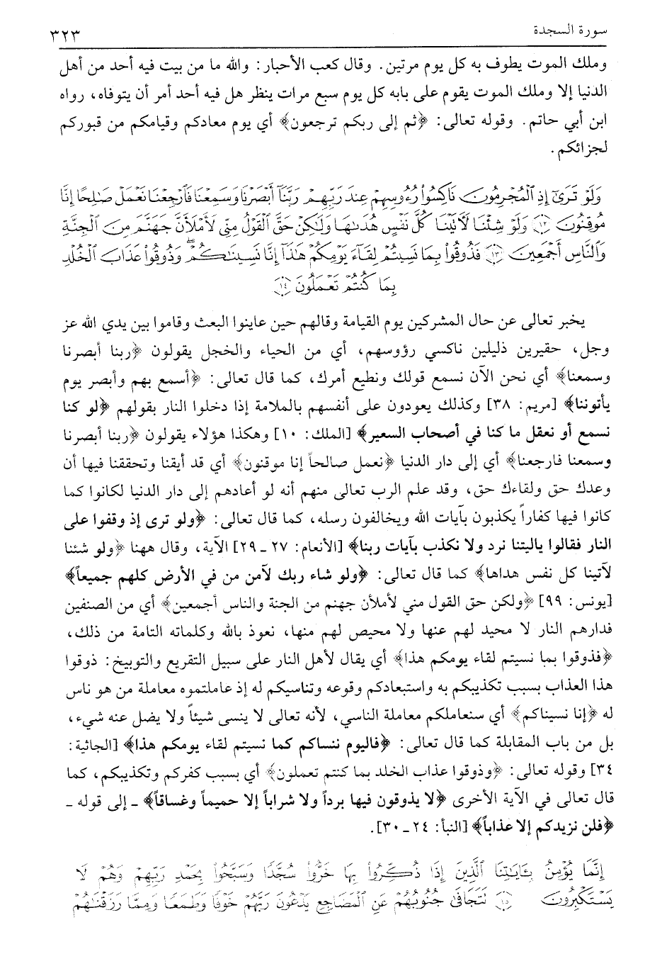 يُخْبِرُ تَعَالَى عن حال المشركين يوم القيامة وقالهم حِينَ عَايَنُوا الْبَعْثَ وَقَامُوا بَيْنَ يَدَيِ اللَّهِ عز وجل، حَقِيرِينَ ذَلِيلِينَ نَاكِسِي رُؤُوسِهِمْ، أَيْ مِنَ الْحَيَاءِ وَالْخَجَلِ يَقُولُونَ رَبَّنا أَبْصَرْنا وَسَمِعْنا أَيْ نَحْنُ الْآنَ نَسْمَعُ قَوْلَكَ وَنُطِيعُ أَمْرَكَ، كَمَا قَالَ تَعَالَى: أَسْمِعْ بِهِمْ وَأَبْصِرْ يَوْمَ يَأْتُونَنا [مَرْيَمَ: 38] وَكَذَلِكَ يَعُودُونَ عَلَى أَنْفُسِهِمْ بِالْمَلَامَةِ إِذَا دَخَلُوا النَّارَ بِقَوْلِهِمْ لَوْ كُنَّا نَسْمَعُ أَوْ نَعْقِلُ مَا كُنَّا فِي أَصْحابِ السَّعِيرِ [الْمُلْكِ: 10] وَهَكَذَا هَؤُلَاءِ يَقُولُونَ رَبَّنا أَبْصَرْنا وَسَمِعْنا فَارْجِعْنا أَيْ إلى دار الدُّنْيَا نَعْمَلْ صالِحاً إِنَّا مُوقِنُونَ أَيْ قَدْ أيقنا وتحققنا فيها أَنَّ وَعْدَكَ حَقٌّ وَلِقَاءَكَ حَقٌّ، وَقَدْ عَلِمَ الرَّبُّ تَعَالَى مِنْهُمْ أَنَّهُ لَوْ أَعَادَهُمْ إِلَى دار الدُّنْيَا لَكَانُوا كَمَا كَانُوا فِيهَا كُفَّارًا يُكْذِّبُونَ بآيات الله ويخالفون رسله، كَمَا قَالَ تَعَالَى: وَلَوْ تَرى إِذْ وُقِفُوا عَلَى النَّارِ فَقالُوا يَا لَيْتَنا نُرَدُّ وَلا نُكَذِّبَ بِآياتِ رَبِّنا [الأنعام: 27- 29] الآية، وَقَالَ هَاهُنَا وَلَوْ شِئْنا لَآتَيْنا كُلَّ نَفْسٍ هُداها كَمَا قَالَ تَعَالَى: وَلَوْ شاءَ رَبُّكَ لَآمَنَ مَنْ فِي الْأَرْضِ كُلُّهُمْ جَمِيعاً [يُونُسَ: 99] وَلكِنْ حَقَّ الْقَوْلُ مِنِّي لَأَمْلَأَنَّ جَهَنَّمَ مِنَ الْجِنَّةِ وَالنَّاسِ أَجْمَعِينَ أَيْ مِنَ الصِّنْفَيْنِ فَدَارُهُمُ النَّارُ لَا مَحِيدَ لَهُمْ عَنْهَا وَلَا مَحِيصَ لَهُمْ مِنْهَا، نَعُوذُ بِاللَّهِ وَكَلِمَاتِهِ التَّامَّةِ مِنْ ذَلِكَ، فَذُوقُوا بِما نَسِيتُمْ لِقاءَ يَوْمِكُمْ هَذَا أَيْ يُقَالُ لِأَهْلِ النَّارِ عَلَى سَبِيلِ التَّقْرِيعِ وَالتَّوْبِيخِ: ذُوقُوا هَذَا الْعَذَابَ بِسَبَبِ تَكْذِيبِكُمْ بِهِ وَاسْتِبْعَادِكُمْ وُقُوعَهُ وَتَنَاسِيكُمْ لَهُ إِذْ عَامَلْتُمُوهُ مُعَامَلَةَ مَنْ هُوَ نَاسٍ لَهُ إِنَّا نَسِيناكُمْ أَيْ سَنُعَامِلُكُمْ مُعَامَلَةَ النَّاسِي، لِأَنَّهُ تَعَالَى لَا يَنْسَى شَيْئًا وَلَا يَضِلُّ عَنْهُ شَيْءٌ، بَلْ مِنْ بَابِ الْمُقَابَلَةِ كَمَا قَالَ تَعَالَى: الْيَوْمَ نَنْساكُمْ كَما نَسِيتُمْ لِقاءَ يَوْمِكُمْ هَذَا [الْجَاثِيَةِ:
