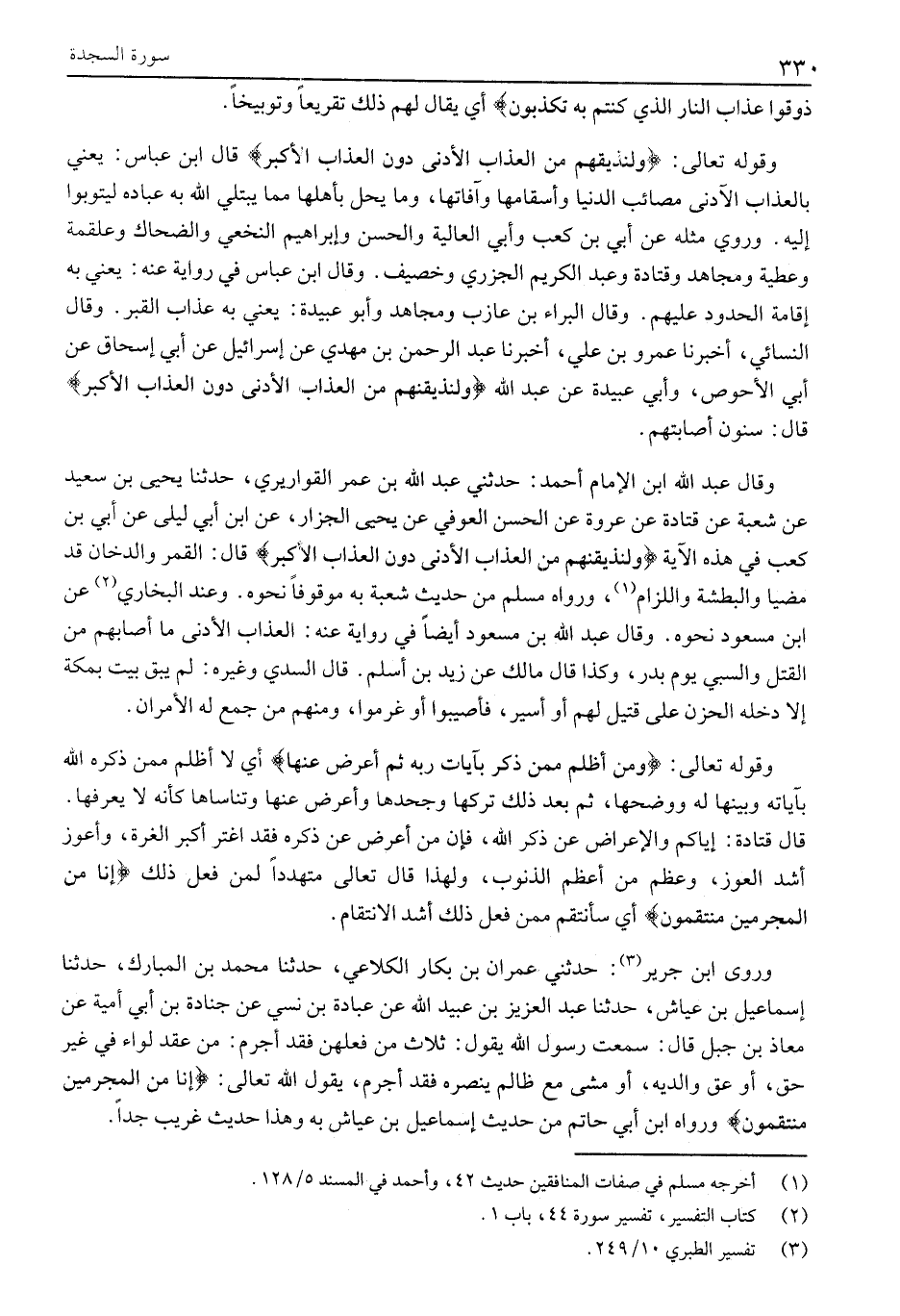 وقوله تعالى: وَلَنُذِيقَنَّهُمْ مِنَ الْعَذابِ الْأَدْنى دُونَ الْعَذابِ الْأَكْبَرِ قَالَ ابْنُ عَبَّاسٍ: يَعْنِي بِالْعَذَابِ الْأَدْنَى مَصَائِبَ الدُّنْيَا وَأَسْقَامَهَا وَآفَاتِهَا، وَمَا يَحِلُّ بِأَهْلِهَا مِمَّا يَبْتَلِي اللَّهُ بِهِ عِبَادَهُ لِيَتُوبُوا إِلَيْهِ. وَرُوِيَ مِثْلُهُ عَنْ أُبَيِّ بْنِ كَعْبٍ وَأَبِي الْعَالِيَةِ وَالْحَسَنِ وَإِبْرَاهِيمَ النَّخَعِيِّ وَالضَّحَّاكِ وَعَلْقَمَةَ وَعَطِيَّةَ وَمُجَاهِدٍ وَقَتَادَةَ وَعَبْدِ الْكَرِيمِ الْجَزَرِيِّ وَخَصِيفٍ. وَقَالَ ابْنُ عَبَّاسٍ فِي رِوَايَةٍ عَنْهُ: يَعْنِي بِهِ إِقَامَةَ الْحُدُودِ عَلَيْهِمْ. وَقَالَ الْبَرَاءُ بْنُ عَازِبٍ وَمُجَاهِدٌ وَأَبُو عُبَيْدَةَ: يَعْنِي بِهِ عَذَابَ الْقَبْرِ. وَقَالَ النَّسَائِيُّ، أَخْبَرَنَا عَمْرُو بْنُ عَلِيٍّ، أَخْبَرَنَا عَبْدُ الرَّحْمَنِ بْنُ مَهْدِيٍّ عَنْ إِسْرَائِيلَ عَنْ أَبِي إِسْحَاقَ عَنْ أَبِي الْأَحْوَصِ، وَأَبِي عُبَيْدَةَ عَنْ عَبْدِ اللَّهِ وَلَنُذِيقَنَّهُمْ مِنَ الْعَذابِ الْأَدْنى دُونَ الْعَذابِ الْأَكْبَرِ قَالَ: سُنُونَ أَصَابَتْهُمْ.