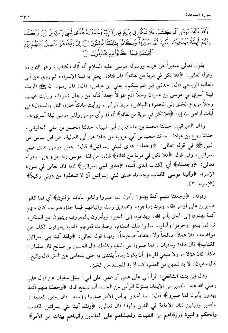 وَلَقَدْ آتَيْنا مُوسَى الْكِتابَ فَلا تَكُنْ فِي مِرْيَةٍ مِنْ لِقائِهِ وَجَعَلْناهُ هُدىً لِبَنِي إِسْرائِيلَ (23) وَجَعَلْنا مِنْهُمْ أَئِمَّةً يَهْدُونَ بِأَمْرِنا لَمَّا صَبَرُوا وَكانُوا بِآياتِنا يُوقِنُونَ (24) إِنَّ رَبَّكَ هُوَ يَفْصِلُ بَيْنَهُمْ يَوْمَ الْقِيامَةِ فِيما كانُوا فِيهِ يَخْتَلِفُونَ (25)