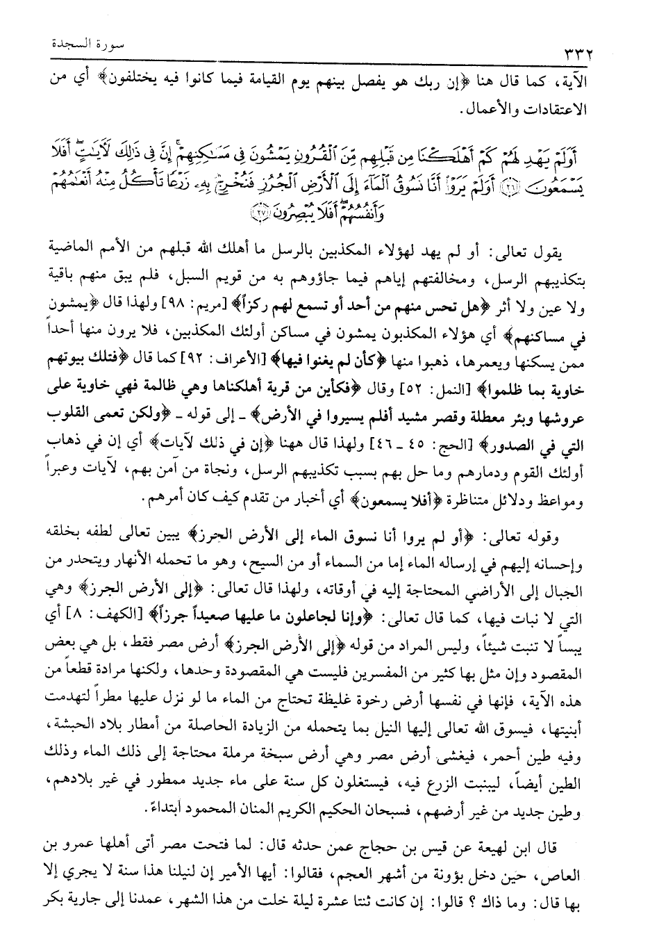 وقوله تَعَالَى: أَوَلَمْ يَرَوْا أَنَّا نَسُوقُ الْماءَ إِلَى الْأَرْضِ الْجُرُزِ يُبَيِّنُ تَعَالَى لُطْفَهُ بِخَلْقِهِ وَإِحْسَانَهُ إِلَيْهِمْ فِي إِرْسَالِهِ الْمَاءَ إِمَّا مِنَ السَّمَاءِ أَوْ مِنَ السَّيْحِ، وَهُوَ مَا تَحْمِلُهُ الْأَنْهَارُ ويتحدر مِنَ الْجِبَالِ إِلَى الْأَرَاضِي الْمُحْتَاجَةِ إِلَيْهِ فِي أوقاته، ولهذا قال تعالى: إِلَى الْأَرْضِ الْجُرُزِ وهي الَّتِي لَا نَبَاتَ فِيهَا، كَمَا قَالَ تَعَالَى: وَإِنَّا لَجاعِلُونَ مَا عَلَيْها صَعِيداً جُرُزاً [الْكَهْفِ: 8] أَيْ يَبَسًا لَا تُنْبِتُ شَيْئًا، وَلَيْسَ الْمُرَادُ مِنْ قَوْلِهِ إِلَى الْأَرْضِ الْجُرُزِ أَرْضَ مِصْرَ فَقَطْ، بَلْ هِيَ بَعْضُ الْمَقْصُودِ وَإِنْ مَثَّلَ بِهَا كَثِيرٌ مِنَ الْمُفَسِّرِينَ فَلَيْسَتْ هِيَ الْمَقْصُودَةُ وَحْدَهَا، وَلَكِنَّهَا مُرَادَّةٌ قَطْعًا مِنْ هَذِهِ الْآيَةِ، فَإِنَّهَا فِي نَفْسِهَا أَرْضٌ رَخْوَةٌ غَلِيظَةٌ تَحْتَاجُ مِنَ الْمَاءِ مَا لَوْ نَزَّلَ عَلَيْهَا مَطَرًا لتهدمت أبنيتها، فيسوق الله تعالى إِلَيْهَا النَّيْلَ بِمَا يَتَحَمَّلُهُ مِنَ الزِّيَادَةِ الْحَاصِلَةِ مِنْ أَمْطَارِ بِلَادِ الْحَبَشَةِ، وَفِيهِ طِينٌ أَحْمَرُ، فَيَغْشَى أَرْضَ مِصْرَ وَهِيَ أَرْضٌ سَبَخَةٌ مُرْمِلَةٌ مُحْتَاجَةٌ إِلَى ذَلِكَ الْمَاءِ وَذَلِكَ الطِّينِ أَيْضًا، لِيَنْبُتَ الزَّرْعُ فِيهِ، فَيَسْتَغِلُّونَ كُلَّ سَنَةٍ عَلَى مَاءٍ جَدِيدٍ مَمْطُورٍ فِي غَيْرِ بِلَادِهِمْ، وَطِينٍ جَدِيدٍ مِنْ غَيْرِ أَرْضِهِمْ، فَسُبْحَانَ الْحَكِيمِ الْكَرِيمِ الْمَنَّانِ الْمَحْمُودِ ابْتِدَاءً.
