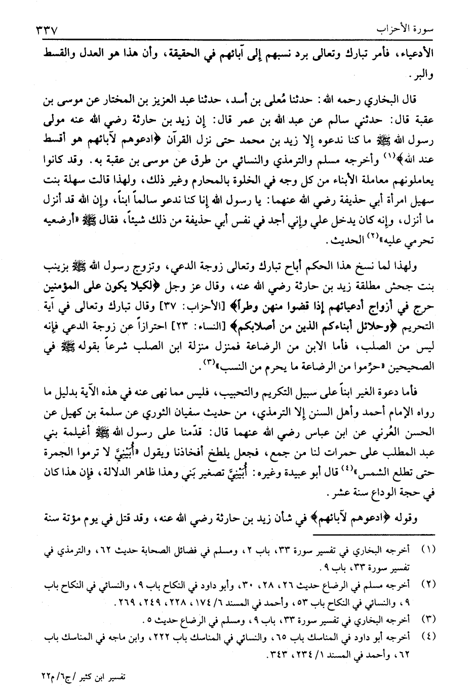 وَقَوْلُهُ ادْعُوهُمْ لِآبائِهِمْ فِي شَأْنِ زَيْدِ بن حارثة رضي الله عنه، وقد قتل في يوم مؤتة سنة