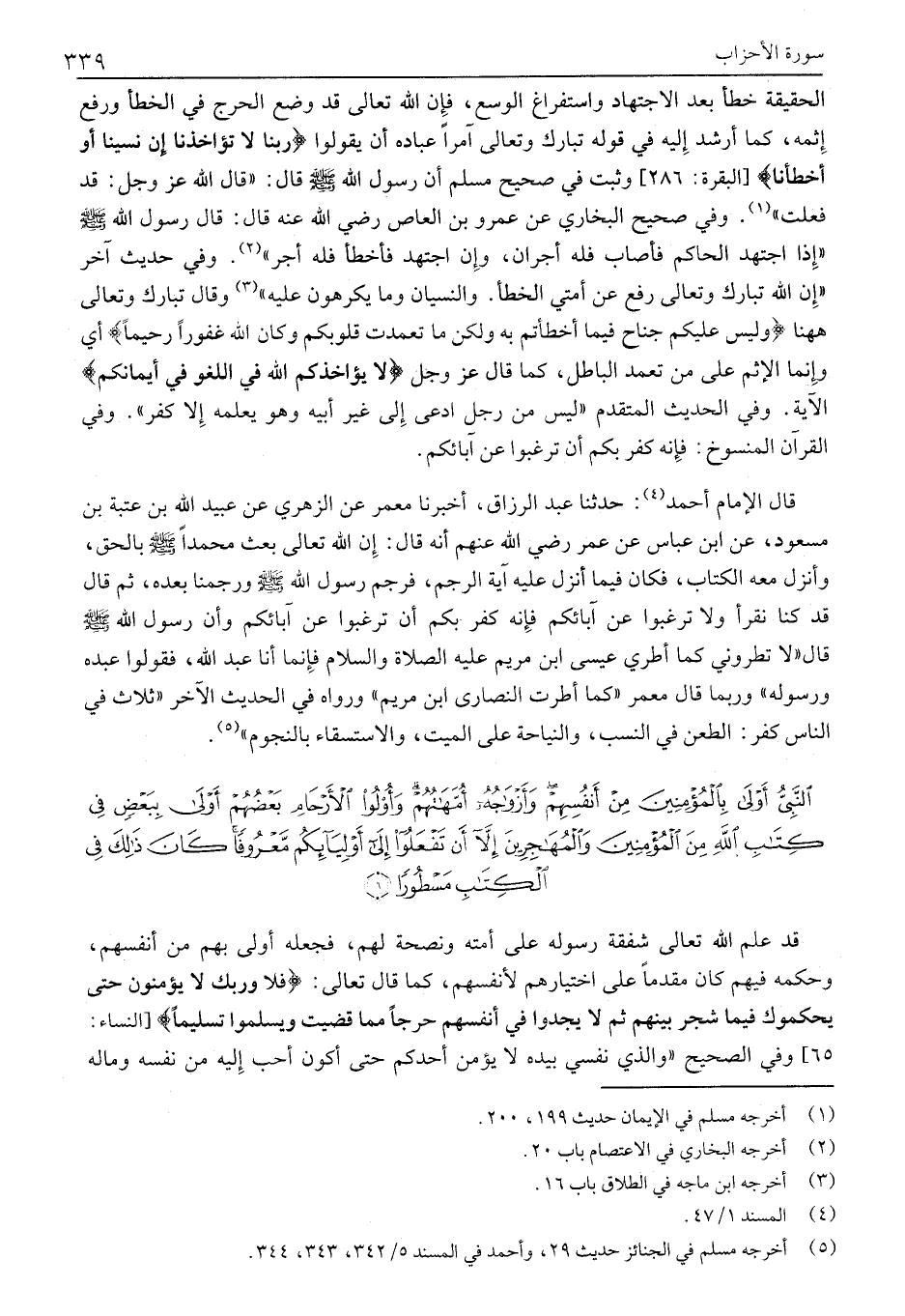 الْحَقِيقَةِ خَطَأً بَعْدَ الِاجْتِهَادِ وَاسْتِفْرَاغِ الْوُسْعِ، فَإِنَّ الله تعالى قَدْ وَضَعَ الْحَرَجَ فِي الْخَطَأِ وَرَفَعَ إِثْمَهُ، كما أرشد إليه في قوله تبارك وتعالى آمِرًا عِبَادَهُ أَنْ يَقُولُوا رَبَّنا لَا تُؤاخِذْنا إِنْ نَسِينا أَوْ أَخْطَأْنا [الْبَقَرَةِ: 286] وَثَبَتَ فِي صَحِيحِ مُسْلِمٍ أَنَّ رَسُولَ اللَّهِ صَلَّى اللَّهُ عَلَيْهِ وَسَلَّمَ قَالَ: «قَالَ اللَّهُ عَزَّ وَجَلَّ: قَدْ فَعَلْتُ» «1» . وَفِي صَحِيحِ الْبُخَارِيِّ عَنْ عَمْرِو بْنِ الْعَاصِ رَضِيَ اللَّهُ عَنْهُ قَالَ: قَالَ رَسُولُ اللَّهِ صَلَّى اللَّهُ عَلَيْهِ وَسَلَّمَ «إِذَا اجْتَهَدَ الْحَاكِمُ فَأَصَابَ فَلَهُ أَجْرَانِ، وَإِنِ اجْتَهَدَ فَأَخْطَأَ فَلَهُ أجر» «2» . وفي حديث آخر «إن الله تبارك وتعالى رَفَعَ عَنْ أُمَّتِي الْخَطَأَ. وَالنِّسْيَانَ وَمَا يُكْرَهُونَ عليه» «3» وقال تبارك وتعالى هَاهُنَا وَلَيْسَ عَلَيْكُمْ جُناحٌ فِيما أَخْطَأْتُمْ بِهِ وَلكِنْ مَا تَعَمَّدَتْ قُلُوبُكُمْ وَكانَ اللَّهُ غَفُوراً رَحِيماً أَيْ وَإِنَّمَا الْإِثْمُ عَلَى مَنْ تَعَمَّدَ الباطل، كما قال عز وجل لا يُؤاخِذُكُمُ اللَّهُ بِاللَّغْوِ فِي أَيْمانِكُمْ الآية. وفي الحديث المتقدم «ليس من رجل ادَّعَى إِلَى غَيْرِ أَبِيهِ وَهُوَ يَعْلَمُهُ إِلَّا كفر» . وفي القرآن المنسوخ: فإنه كفر بِكُمْ أَنْ تَرْغَبُوا عَنْ آبَائِكُمْ.