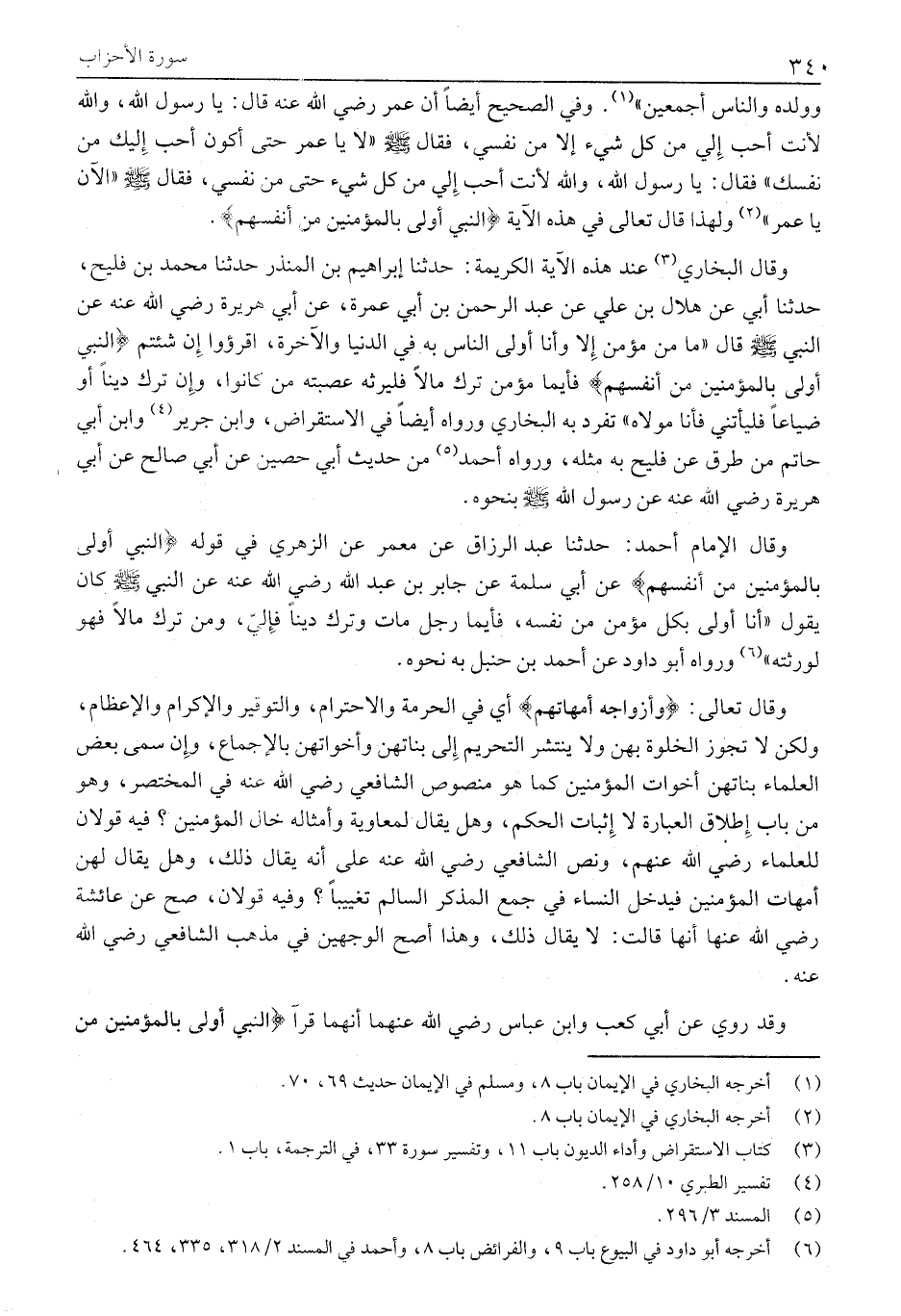وقال البخاري «3» عند هذه الآية الكريمة: حَدَّثَنَا إِبْرَاهِيمُ بْنُ الْمُنْذِرِ حَدَّثَنَا مُحَمَّدُ بْنُ فُلَيْحٍ، حَدَّثَنَا أَبِي عَنْ هِلَالِ بْنِ عَلِيٍّ عَنْ عَبْدِ الرَّحْمَنِ بْنِ أَبِي عَمْرَةَ، عَنْ أَبِي هُرَيْرَةَ رَضِيَ اللَّهُ عَنْهُ عَنِ النَّبِيِّ صَلَّى اللَّهُ عَلَيْهِ وَسَلَّمَ قَالَ «مَا مِنْ مُؤْمِنٍ إِلَّا وَأَنَا أَوْلَى النَّاسِ بِهِ فِي الدنيا والآخرة، اقرءوا إِنْ شِئْتُمْ النَّبِيُّ أَوْلى بِالْمُؤْمِنِينَ مِنْ أَنْفُسِهِمْ فَأَيُّمَا مُؤْمِنٍ تَرَكَ مَالًا فَلْيَرِثْهُ عَصَبَتُهُ مَنْ كانوا، وإن تَرَكَ دَيْنًا أَوْ ضَيَاعًا فَلْيَأْتِنِي فَأَنَا مَوْلَاهُ» تَفَرَّدَ بِهِ الْبُخَارِيُّ وَرَوَاهُ أَيْضًا فِي الِاسْتِقْرَاضِ، وَابْنُ جَرِيرٍ «4» وَابْنُ أَبِي حَاتِمٍ مِنْ طُرُقٍ عَنْ فليح به مثله، ورواه أَحْمَدُ «5» مِنْ حَدِيثِ أَبِي حَصِينٍ عَنْ أَبِي صَالِحٍ عَنْ أَبِي هُرَيْرَةَ رَضِيَ اللَّهُ عَنْهُ عَنْ رَسُولِ اللَّهِ صَلَّى اللَّهُ عَلَيْهِ وَسَلَّمَ بِنَحْوِهِ.