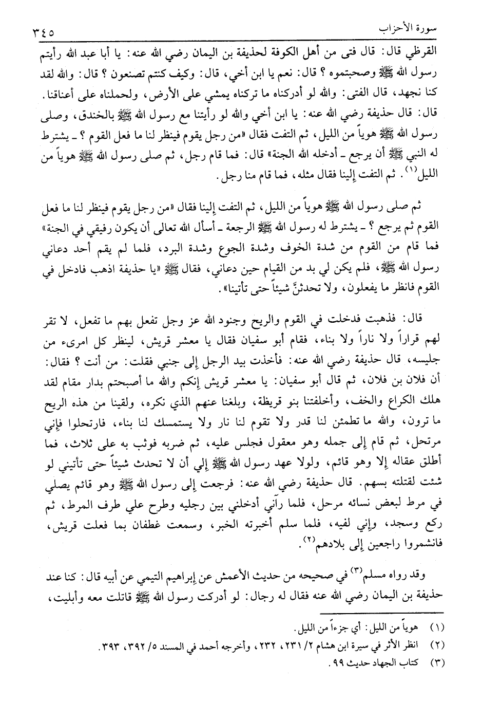قَالَ: قَالَ حُذَيْفَةُ رضي الله عنه: يَا ابْنَ أَخِي وَاللَّهِ لَوْ رَأَيْتَنَا مَعَ رَسُولِ اللَّهِ صَلَّى اللَّهُ عَلَيْهِ وَسَلَّمَ بِالْخَنْدَقِ، وَصَلَّى رَسُولُ اللَّهِ صَلَّى اللَّهُ عَلَيْهِ وَسَلَّمَ هَوِيًّا مِنَ اللَّيْلِ، ثُمَّ الْتَفَتَ فَقَالَ «مَنْ رَجُلٌ يَقُومُ فَيَنْظُرُ لَنَا مَا فَعَلَ الْقَوْمُ؟ - يشترط له النبي صلى الله عليه وسلم أن يَرْجِعُ- أَدْخَلَهُ اللَّهُ الْجَنَّةَ» قَالَ: فَمَا قَامَ رَجُلٌ، ثُمَّ صَلَّى رَسُولُ اللَّهِ صَلَّى اللَّهُ عَلَيْهِ وَسَلَّمَ هَوِيًّا مِنَ اللَّيْلِ «1» . ثُمَّ الْتَفَتَ إِلَيْنَا فَقَالَ مِثْلَهُ، فَمَا قَامَ مِنَّا رَجُلٌ.