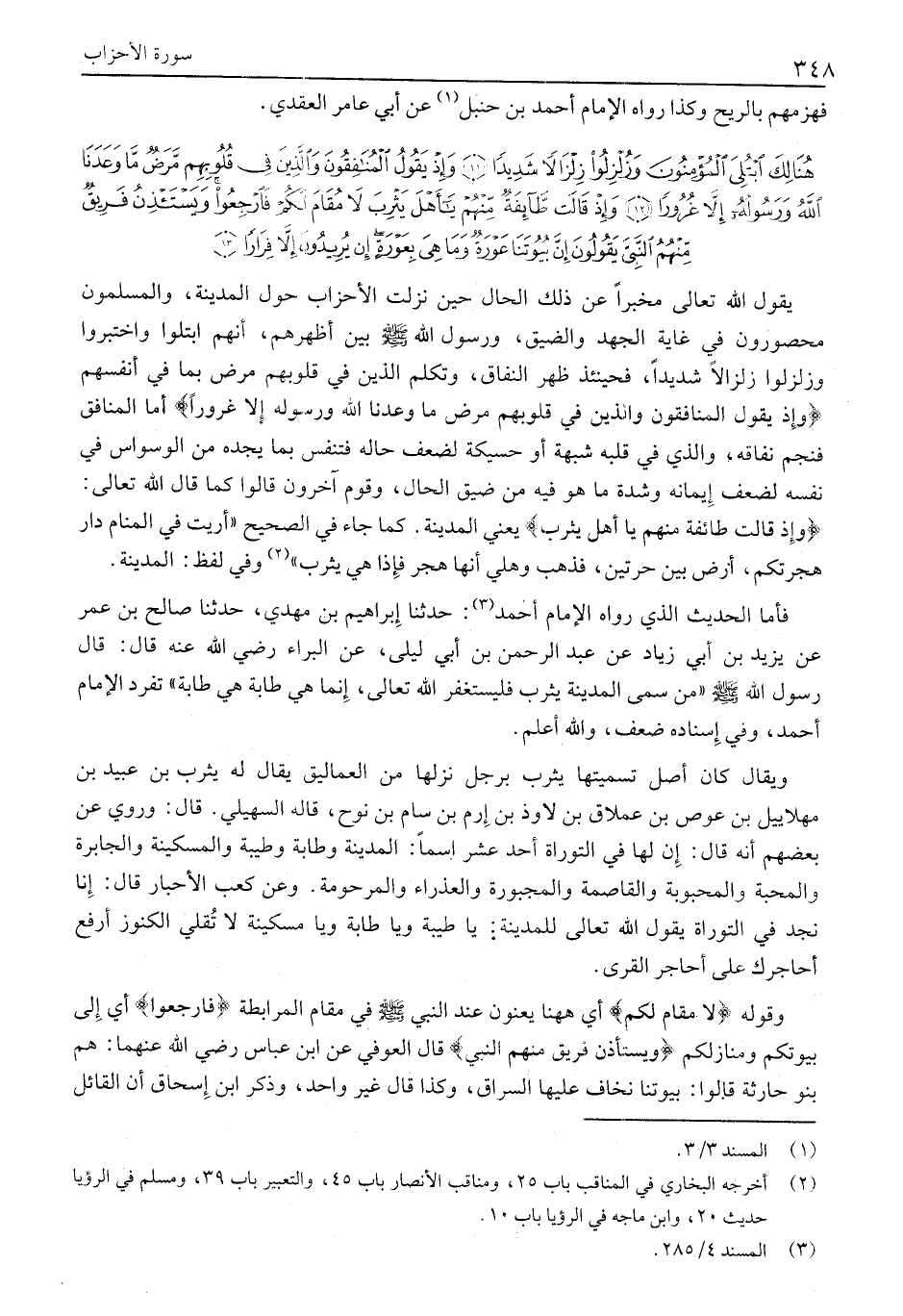 هُنالِكَ ابْتُلِيَ الْمُؤْمِنُونَ وَزُلْزِلُوا زِلْزالاً شَدِيداً (11) وَإِذْ يَقُولُ الْمُنافِقُونَ وَالَّذِينَ فِي قُلُوبِهِمْ مَرَضٌ مَا وَعَدَنَا اللَّهُ وَرَسُولُهُ إِلاَّ غُرُوراً (12) وَإِذْ قالَتْ طائِفَةٌ مِنْهُمْ يَا أَهْلَ يَثْرِبَ لَا مُقامَ لَكُمْ فَارْجِعُوا وَيَسْتَأْذِنُ فَرِيقٌ مِنْهُمُ النَّبِيَّ يَقُولُونَ إِنَّ بُيُوتَنا عَوْرَةٌ وَما هِيَ بِعَوْرَةٍ إِنْ يُرِيدُونَ إِلاَّ فِراراً (13)