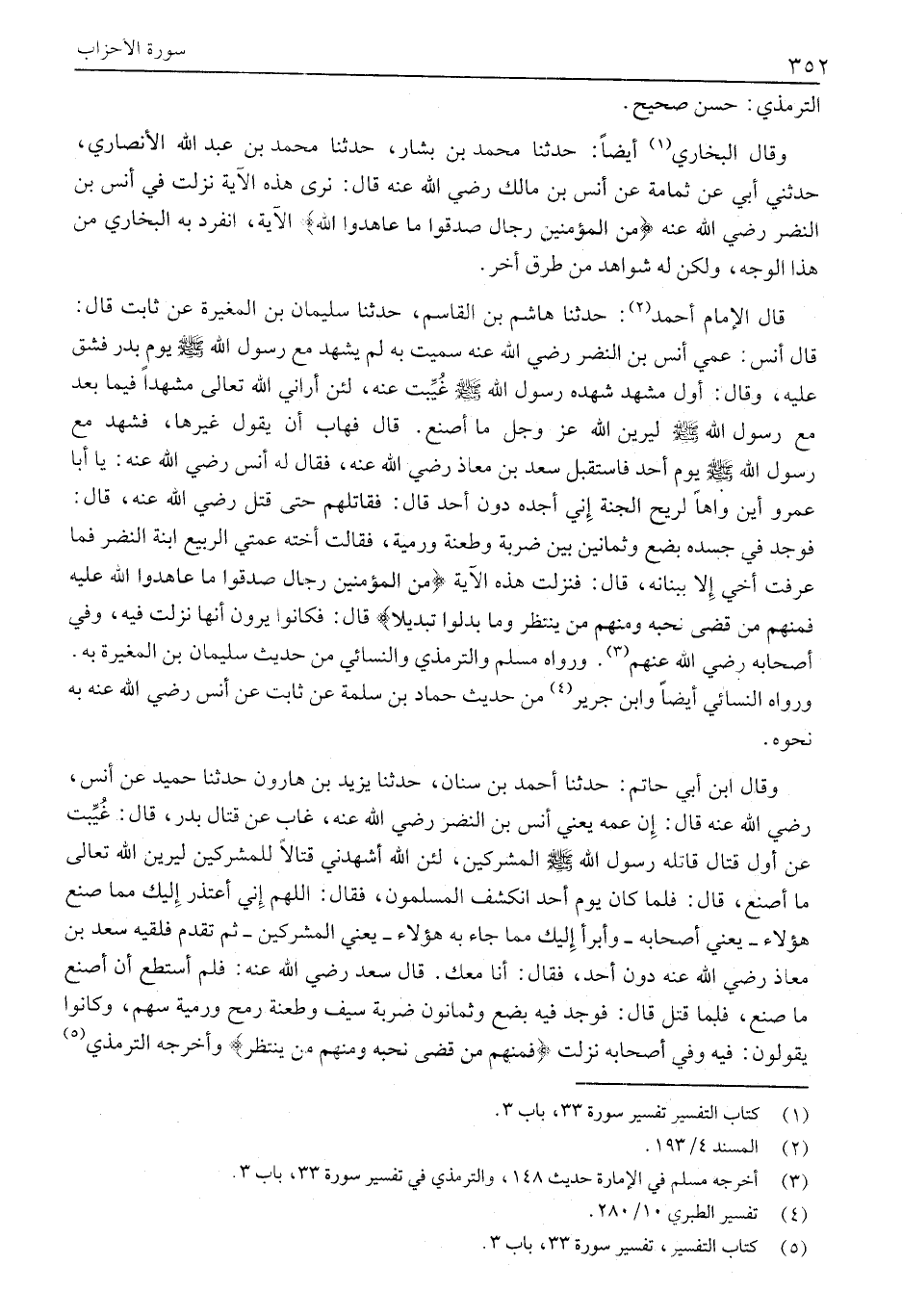وَقَالَ ابْنُ أَبِي حَاتِمٍ: حَدَّثَنَا أَحْمَدُ بْنُ سِنَانٍ، حَدَّثَنَا يَزِيدُ بْنُ هَارُونَ حَدَّثَنَا حُمَيْدٌ عَنْ أَنَسٍ، رَضِيَ اللَّهُ عَنْهُ قَالَ: إن عمه يعني أنس بن النضر رضي الله عنه، غاب عن قتال بدر، قال: غُيِّبْتُ عَنْ أَوَّلِ قِتَالٍ قَاتَلَهُ رَسُولُ اللَّهِ صَلَّى اللَّهُ عَلَيْهِ وَسَلَّمَ الْمُشْرِكِينَ، لَئِنِ اللَّهُ أشهدني قتالا للمشركين ليرين الله تعالى مَا أَصْنَعُ، قَالَ: فَلَمَّا كَانَ يَوْمَ أُحُدٍ انْكَشَفَ الْمُسْلِمُونَ، فَقَالَ: اللَّهُمَّ إِنِّي أَعْتَذِرُ إِلَيْكَ مِمَّا صَنَعَ هَؤُلَاءِ- يَعْنِي أَصْحَابَهُ- وَأَبْرَأُ إِلَيْكَ مما جاء به هَؤُلَاءِ- يَعْنِي الْمُشْرِكِينَ- ثُمَّ تَقَدَّمَ فَلَقِيَهُ سَعْدٌ بن معاذ رضي الله عنه دُونَ أُحُدٍ، فَقَالَ: أَنَا مَعَكَ. قَالَ سَعْدٌ رضي الله عنه: فلم أستطع أن أصنع ما صنع، فلما قتل قَالَ: فَوُجِدَ فِيهِ بِضْعٌ وَثَمَانُونَ ضَرْبَةَ سَيْفٍ وَطَعْنَةَ رُمْحٍ وَرَمْيَةَ سَهْمٍ، وَكَانُوا يَقُولُونَ: فِيهِ وَفِي أَصْحَابِهِ نَزَلَتْ فَمِنْهُمْ مَنْ قَضى نَحْبَهُ وَمِنْهُمْ مَنْ يَنْتَظِرُ وأخرجه الترمذي «5»