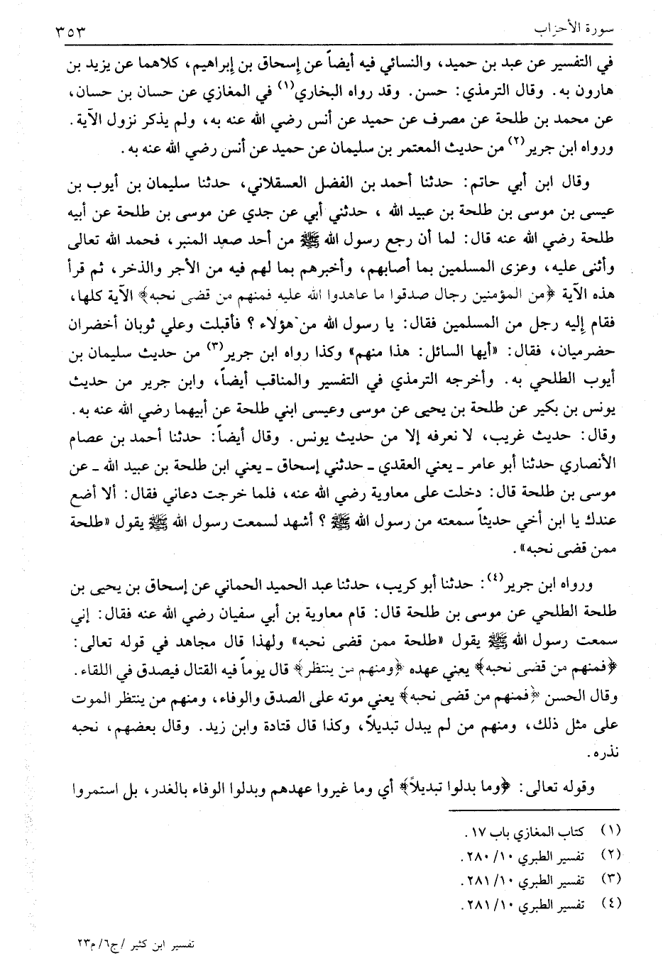 وَقَالَ ابْنُ أَبِي حَاتِمٍ: حَدَّثَنَا أَحْمَدُ بْنُ الْفَضْلِ الْعَسْقَلَانِيُّ، حَدَّثَنَا سُلَيْمَانُ بْنُ أَيُّوبَ بْنِ عِيسَى بْنِ مُوسَى بْنِ طَلْحَةَ بْنِ عُبَيْدِ اللَّهِ، حَدَّثَنِي أَبِي عَنْ جَدِّي عَنْ موسى بن طلحة عن أبيه طلحة رضي الله عنه قال: لما أن رَجَعَ رَسُولُ اللَّهِ صَلَّى اللَّهُ عَلَيْهِ وَسَلَّمَ من أحد صعد المنبر، فحمد الله تعالى وَأَثْنَى عَلَيْهِ، وَعَزَّى الْمُسْلِمِينَ بِمَا أَصَابَهُمْ، وَأَخْبَرَهُمْ بِمَا لَهُمْ فِيهِ مِنَ الْأَجْرِ وَالذُّخْرِ، ثُمَّ قرأ هذه الآية مِنَ الْمُؤْمِنِينَ رِجالٌ صَدَقُوا مَا عاهَدُوا اللَّهَ عَلَيْهِ فَمِنْهُمْ مَنْ قَضى نَحْبَهُ الآية كلها، فَقَامَ إِلَيْهِ رَجُلٌ مِنَ الْمُسْلِمِينَ فَقَالَ: يَا رَسُولَ اللَّهِ مَنْ هَؤُلَاءِ؟ فَأَقْبَلْتُ وَعَلَيَّ ثَوْبَانِ أَخْضَرَانِ حَضْرَمِيَّانِ، فَقَالَ: «أَيُّهَا السَّائِلُ: هَذَا مِنْهُمْ» وَكَذَا رَوَاهُ ابْنُ جَرِيرٍ «3» مِنْ حَدِيثِ سُلَيْمَانَ بْنِ أَيُّوبَ الطَّلْحِيِّ بِهِ. وَأَخْرَجَهُ التِّرْمِذِيُّ فِي التَّفْسِيرِ وَالْمَنَاقِبِ أَيْضًا، وَابْنُ جَرِيرٍ مِنْ حَدِيثِ يُونُسَ بْنِ بُكَيْرٍ عَنْ طَلْحَةَ بْنِ يَحْيَى عَنْ مُوسَى وَعِيسَى ابْنِي طَلْحَةَ عَنْ أَبِيهِمَا رضي الله عنه به.