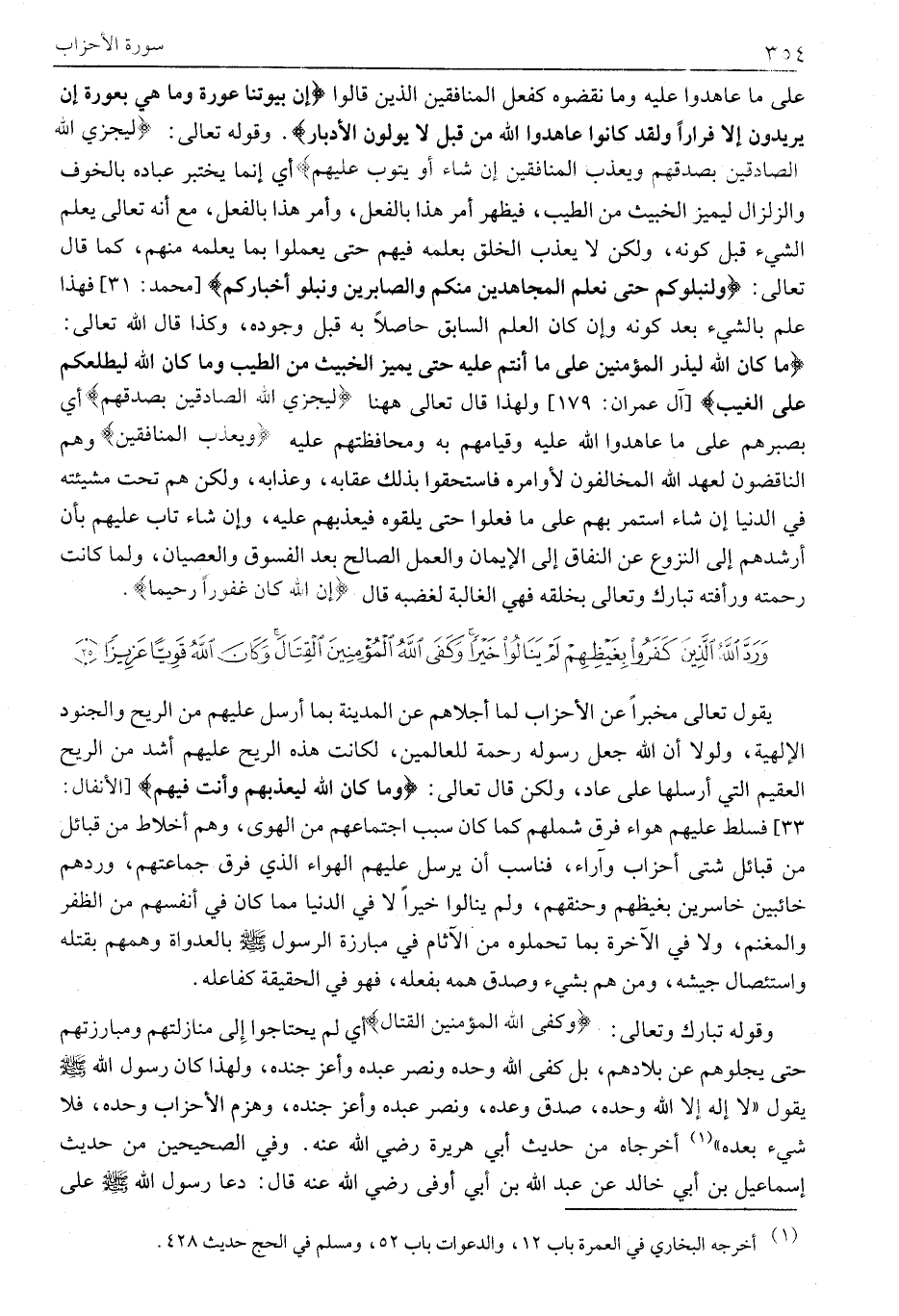وقوله تبارك وتعالى: وَكَفَى اللَّهُ الْمُؤْمِنِينَ الْقِتالَ أَيْ لَمْ يَحْتَاجُوا إِلَى مُنَازَلَتِهِمْ وَمُبَارَزَتِهِمْ حَتَّى يُجْلُوهُمْ عَنْ بِلَادِهِمْ، بَلْ كَفَى اللَّهُ وَحْدَهُ وَنَصَرَ عَبْدَهُ وَأَعَزَّ جنده، وَلِهَذَا كَانَ رَسُولُ اللَّهِ صَلَّى اللَّهُ عَلَيْهِ وَسَلَّمَ يقول «لَا إِلَهَ إِلَّا اللَّهُ وَحْدَهُ، صَدَقَ وَعْدَهُ، وَنَصَرَ عَبْدَهُ وَأَعَزَّ جُنْدَهُ، وَهَزَمَ الْأَحْزَابَ وَحْدَهُ، فَلَا شَيْءَ بَعْدَهُ» «1» أَخْرَجَاهُ مِنْ حَدِيثِ أَبِي هريرة رضي الله عنه. وَفِي الصَّحِيحَيْنِ مِنْ حَدِيثِ إِسْمَاعِيلَ بْنِ أَبِي خَالِدٍ عَنِ عَبْدِ اللَّهِ بْنِ أَبِي أَوْفَى رضي الله عنه قَالَ: دَعَا رَسُولُ اللَّهِ صَلَّى اللَّهُ عَلَيْهِ وَسَلَّمَ على