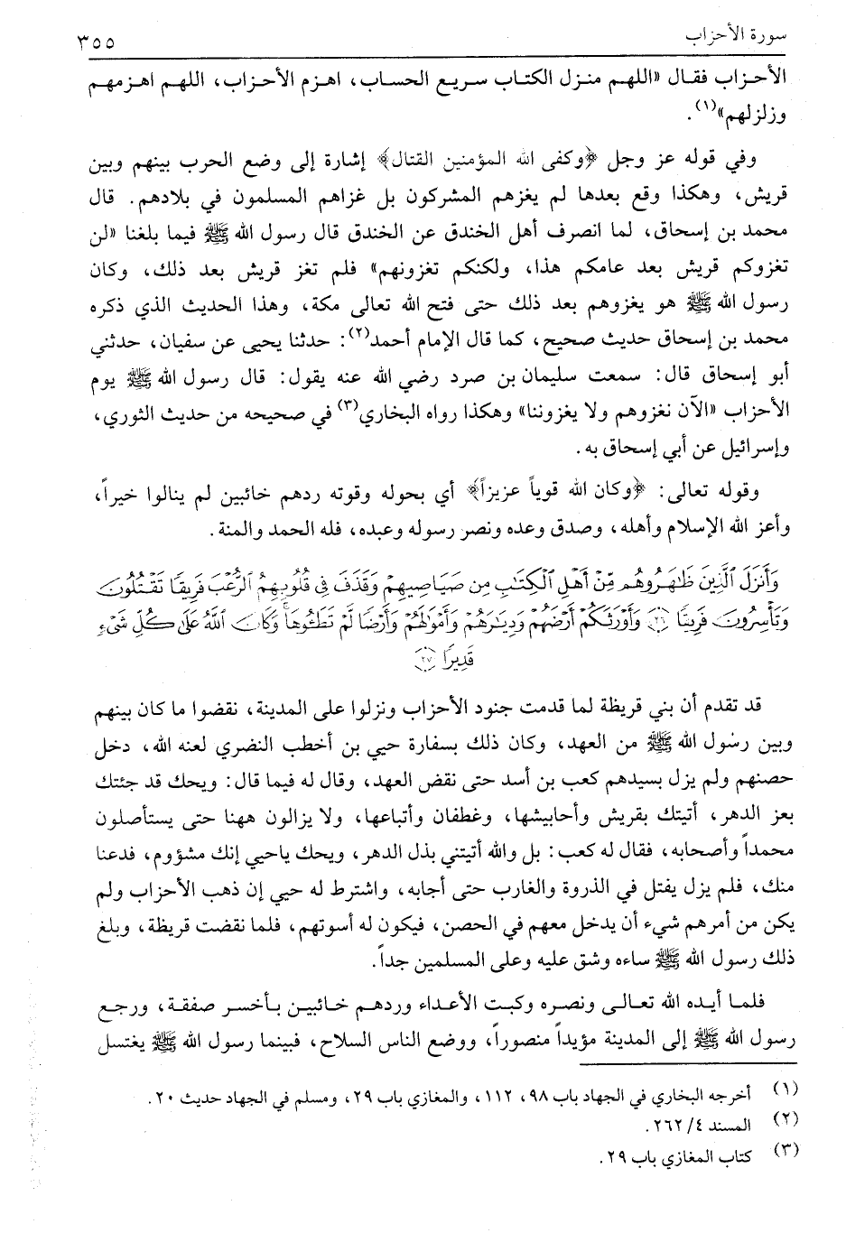 وَفِي قَوْلِهِ عز وجل وَكَفَى اللَّهُ الْمُؤْمِنِينَ الْقِتالَ إِشَارَةٌ إِلَى وَضْعِ الْحَرْبِ بَيْنَهُمْ وَبَيْنَ قُرَيْشٍ، وَهَكَذَا وَقَعَ بَعْدَهَا لَمْ يَغُزْهُمُ الْمُشْرِكُونَ بَلْ غَزَاهُمُ الْمُسْلِمُونَ فِي بِلَادِهِمْ. قَالَ مُحَمَّدُ بْنُ إِسْحَاقَ، لَمَّا انْصَرَفَ أَهْلُ الْخَنْدَقِ عَنِ الْخَنْدَقِ قَالَ رَسُولُ اللَّهِ صَلَّى اللَّهُ عَلَيْهِ وَسَلَّمَ فِيمَا بَلَغْنَا «لَنْ تَغْزُوَكُمْ قُرَيْشٌ بَعْدَ عَامِكُمْ هَذَا، وَلَكِنَّكُمْ تَغْزُونَهُمْ» فلم تغز قريش بعد ذلك، وَكَانَ رَسُولُ اللَّهِ صَلَّى اللَّهُ عَلَيْهِ وَسَلَّمَ هُوَ يَغْزُوهُمْ بَعْدَ ذَلِكَ حَتَّى فَتَحَ اللَّهُ تعالى مَكَّةَ، وَهَذَا الْحَدِيثُ الَّذِي ذَكَرَهُ مُحَمَّدُ بْنُ إِسْحَاقَ حَدِيثٌ صَحِيحٌ، كَمَا قَالَ الْإِمَامُ أَحْمَدُ «2» : حَدَّثَنَا يَحْيَى عَنْ سُفْيَانَ، حَدَّثَنِي أَبُو إِسْحَاقَ قال: سمعت سليمان بن صرد رَضِيَ اللَّهُ عَنْهُ يَقُولُ: قَالَ رَسُولُ اللَّهِ صَلَّى اللَّهُ عَلَيْهِ وسلم يوم الأحزاب «الآن نغزوهم ولا يغزوننا» وَهَكَذَا رَوَاهُ الْبُخَارِيُّ «3» فِي صَحِيحِهِ مِنْ حَدِيثِ الثَّوْرِيِّ، وَإِسْرَائِيلَ عَنْ أَبِي إِسْحَاقَ بِهِ.