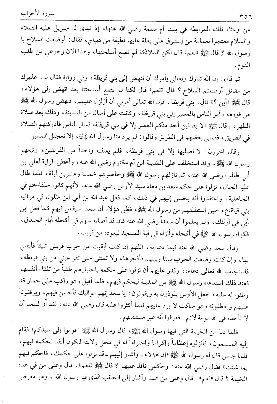 وَقَالَ آخَرُونَ: لَا نُصَلِّيهَا إِلَّا فِي بَنِي قُرَيْظَةَ، فَلَمْ يُعَنِّفْ وَاحِدًا مِنَ الْفَرِيقَيْنِ، وَتَبِعَهُمْ رسول الله صلى الله عليه وسلم، وقد استخلف على المدينة ابن أم مكتوم رضي الله عنه، وأعطى الراية لِعَلِيِّ بْنِ أَبِي طَالِبٍ رَضِيَ اللَّهُ عَنْهُ، ثُمَّ نَازَلَهُمْ رَسُولُ اللَّهِ صَلَّى اللَّهُ عَلَيْهِ وَسَلَّمَ وَحَاصَرَهُمْ خَمْسًا وَعِشْرِينَ لَيْلَةً، فَلَمَّا طَالَ عليه الْحَالُ، نَزَلُوا عَلَى حُكْمِ سَعْدِ بْنِ مُعَاذٍ سيد الأوس رضي الله عنه، لِأَنَّهُمْ كَانُوا حُلَفَاءَهُمْ فِي الْجَاهِلِيَّةِ، وَاعْتَقَدُوا أَنَّهُ يُحْسِنُ إِلَيْهِمْ فِي ذَلِكَ، كَمَا فَعَلَ عَبْدُ اللَّهِ بْنُ أُبَيٍّ ابْنُ سَلُولَ فِي مَوَالِيهِ بَنِي قَيْنُقَاعَ، حِينَ اسْتَطْلَقَهُمْ مِنْ رَسُولِ اللَّهِ صَلَّى اللَّهُ عَلَيْهِ وَسَلَّمَ، فَظَنَّ هَؤُلَاءِ أَنَّ سَعْدًا سَيَفْعَلُ فِيهِمْ كَمَا فَعَلَ ابْنُ أُبَيٍّ فِي أُولَئِكَ، وَلَمْ يَعْلَمُوا أَنَّ سَعْدًا رَضِيَ اللَّهُ عَنْهُ كَانَ قَدْ أَصَابَهُ سَهْمٌ فِي أَكْحَلِهِ أَيَّامَ الْخَنْدَقِ، فَكَوَاهُ رَسُولُ اللَّهِ صَلَّى اللَّهُ عَلَيْهِ وَسَلَّمَ فِي أَكْحَلِهِ وَأَنْزَلَهُ فِي قبة المسجد ليعوده من قريب.