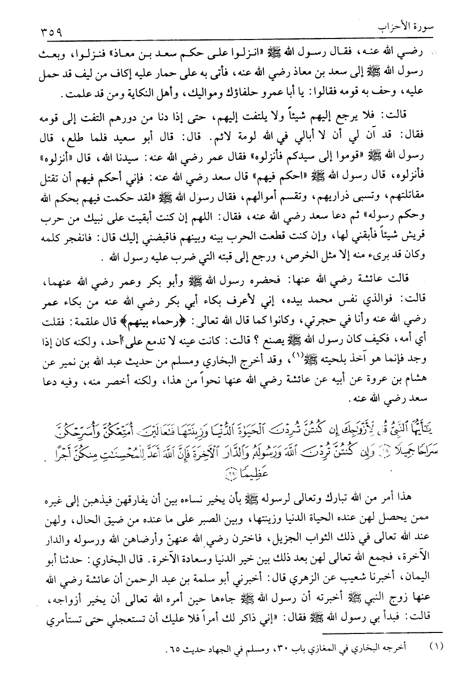 يَا أَيُّهَا النَّبِيُّ قُلْ لِأَزْواجِكَ إِنْ كُنْتُنَّ تُرِدْنَ الْحَياةَ الدُّنْيا وَزِينَتَها فَتَعالَيْنَ أُمَتِّعْكُنَّ وَأُسَرِّحْكُنَّ سَراحاً جَمِيلاً (28) وَإِنْ كُنْتُنَّ تُرِدْنَ اللَّهَ وَرَسُولَهُ وَالدَّارَ الْآخِرَةَ فَإِنَّ اللَّهَ أَعَدَّ لِلْمُحْسِناتِ مِنْكُنَّ أَجْراً عَظِيماً (29)