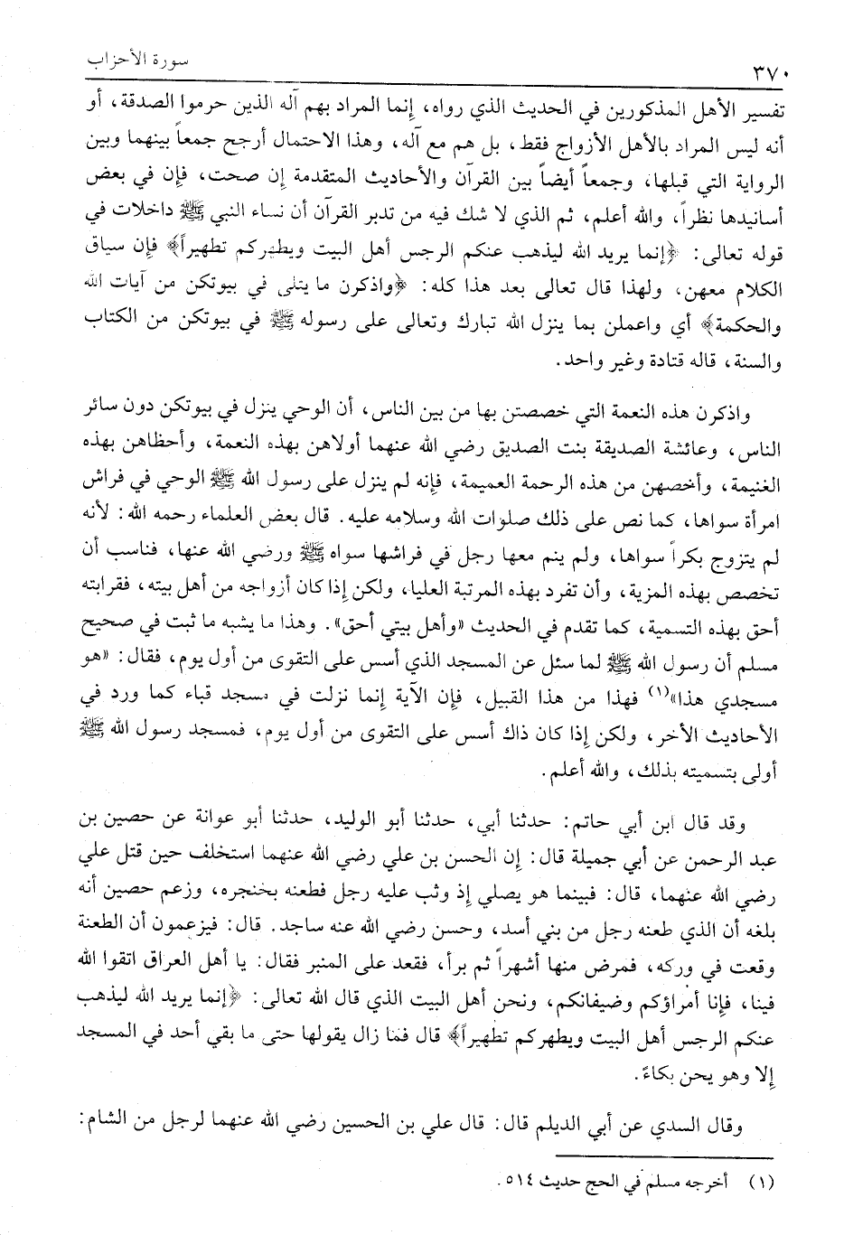 تَفْسِيرَ الْأَهْلِ الْمَذْكُورِينَ فِي الْحَدِيثِ الَّذِي رَوَاهُ، إِنَّمَا الْمُرَادُ بِهِمْ آلُهُ الَّذِينَ حُرِمُوا الصَّدَقَةَ، أَوْ أَنَّهُ لَيْسَ الْمُرَادُ بِالْأَهْلِ الْأَزْوَاجَ فَقَطْ، بَلْ هُمْ مَعَ آلِهِ، وَهَذَا الِاحْتِمَالُ أَرْجَحُ جمعا بينهما وَبَيْنَ الرِّوَايَةِ الَّتِي قَبْلَهَا، وَجَمْعًا أَيْضًا بَيْنَ الْقُرْآنِ وَالْأَحَادِيثِ الْمُتَقَدِّمَةِ إِنْ صَحَّتْ، فَإِنَّ فِي بَعْضِ أَسَانِيدِهَا نَظَرًا، وَاللَّهُ أَعْلَمُ، ثُمَّ الَّذِي لا شك فِيهِ مَنْ تَدَبَّرَ الْقُرْآنَ أَنَّ نِسَاءَ النَّبِيِّ صَلَّى اللَّهُ عَلَيْهِ وَسَلَّمَ دَاخِلَاتٌ فِي قَوْلِهِ تَعَالَى: إِنَّما يُرِيدُ اللَّهُ لِيُذْهِبَ عَنْكُمُ الرِّجْسَ أَهْلَ الْبَيْتِ وَيُطَهِّرَكُمْ تَطْهِيراً فَإِنَّ سِيَاقَ الْكَلَامِ مَعَهُنَّ، وَلِهَذَا قَالَ تَعَالَى بَعْدَ هَذَا كُلِّهِ: وَاذْكُرْنَ مَا يُتْلى فِي بُيُوتِكُنَّ مِنْ آياتِ اللَّهِ وَالْحِكْمَةِ أي واعملن بما ينزل الله تبارك وتعالى عَلَى رَسُولِهِ صَلَّى اللَّهُ عَلَيْهِ وَسَلَّمَ فِي بُيُوتِكُنَّ مِنَ الْكِتَابِ وَالسُّنَّةِ، قَالَهُ قَتَادَةُ وَغَيْرُ وَاحِدٍ.