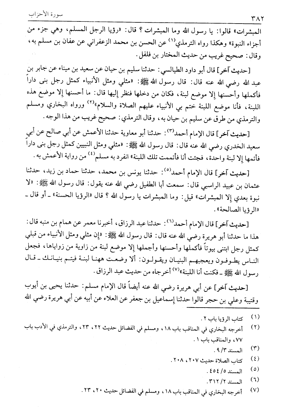 هَذَا مَا حَدَّثَنَا أَبُو هُرَيْرَةَ رَضِيَ اللَّهُ عَنْهُ قَالَ: قَالَ رَسُولُ اللَّهِ صَلَّى اللَّهُ عَلَيْهِ وَسَلَّمَ: «إِنَّ مَثَلِي وَمَثَلَ الْأَنْبِيَاءِ مِنْ قَبْلِي كَمَثَلِ رَجُلٍ ابْتَنَى بيوتا فأكملها وأحسنها وَأَجْمَلَهَا إِلَّا مَوْضِعَ لَبِنَةٍ مِنْ زَاوِيَةٍ مِنْ زَوَايَاهَا، فَجَعَلَ النَّاسُ يَطُوفُونَ وَيُعْجِبُهُمُ الْبُنْيَانُ وَيَقُولُونَ: أَلَا وَضَعْتَ هَاهُنَا لَبِنَةً فَيَتِمُّ بُنْيَانُكَ- قَالَ رَسُولُ اللَّهِ صَلَّى اللَّهُ عَلَيْهِ وَسَلَّمَ- فَكُنْتُ أَنَا اللَّبِنَةُ» «7» أَخْرَجَاهُ مِنْ حَدِيثِ عَبْدِ الرَّزَّاقِ.