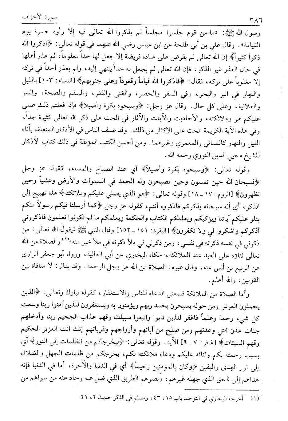 رَسُولِ اللَّهِ صَلَّى اللَّهُ عَلَيْهِ وَسَلَّمَ: «مَا مِنْ قَوْمٍ جَلَسُوا مَجْلِسًا لَمْ يَذْكُرُوا الله تعالى فِيهِ إِلَّا رَأَوْهُ حَسْرَةً يَوْمِ الْقِيَامَةِ» . وَقَالَ عَلِيُّ بْنُ أَبِي طَلْحَةَ عَنِ ابْنِ عَبَّاسٍ رَضِيَ اللَّهُ عَنْهُمَا فِي قَوْلِهِ تَعَالَى: اذْكُرُوا اللَّهَ ذِكْراً كَثِيراً إن الله تعالى لَمْ يَفْرِضْ عَلَى عِبَادِهِ فَرِيضَةً إِلَّا جَعَلَ لَهَا حَدًّا مَعْلُومًا، ثُمَّ عَذَرَ أَهْلَهَا فِي حال العذر غير الذكر، فإن الله تعالى لَمْ يَجْعَلْ لَهُ حَدًّا يَنْتَهِي إِلَيْهِ، وَلَمْ يَعْذُرْ أَحَدًا فِي تَرْكِهِ إِلَّا مَغْلُوبًا عَلَى تَرْكِهِ، فَقَالَ: فَاذْكُرُوا اللَّهَ قِياماً وَقُعُوداً وَعَلى جُنُوبِكُمْ [النِّسَاءِ: 103] بِاللَّيْلِ وَالنَّهَارِ فِي الْبَرِّ وَالْبَحْرِ، وفي السفر والحضر، والغنى والفقر، والسقم والصحة، والسر والعلانية، وعلى كل حال. وقال عز وجل: وَسَبِّحُوهُ بُكْرَةً وَأَصِيلًا فَإِذَا فَعَلْتُمْ ذَلِكَ صَلَّى عَلَيْكُمْ هُوَ وَمَلَائِكَتُهُ، وَالْأَحَادِيثُ وَالْآيَاتُ وَالْآثَارُ فِي الحث على ذكر الله تعالى كَثِيرَةٌ جِدًّا، وَفِي هَذِهِ الْآيَةِ الْكَرِيمَةِ الْحَثُّ عَلَى الْإِكْثَارِ مِنْ ذَلِكَ. وَقَدْ صَنَّفَ النَّاسُ فِي الْأَذْكَارِ الْمُتَعَلِّقَةِ بِآنَاءِ اللَّيْلِ وَالنَّهَارِ كَالنَّسَائِيِّ وَالْمَعْمَرِيِّ وَغَيْرِهِمَا. وَمِنْ أَحْسَنِ الْكُتُبِ الْمُؤَلَّفَةِ فِي ذَلِكَ كِتَابُ الْأَذْكَارِ لِلشَّيْخِ مُحْيِي الدِّينِ النَّوَوِيِّ رحمه الله.