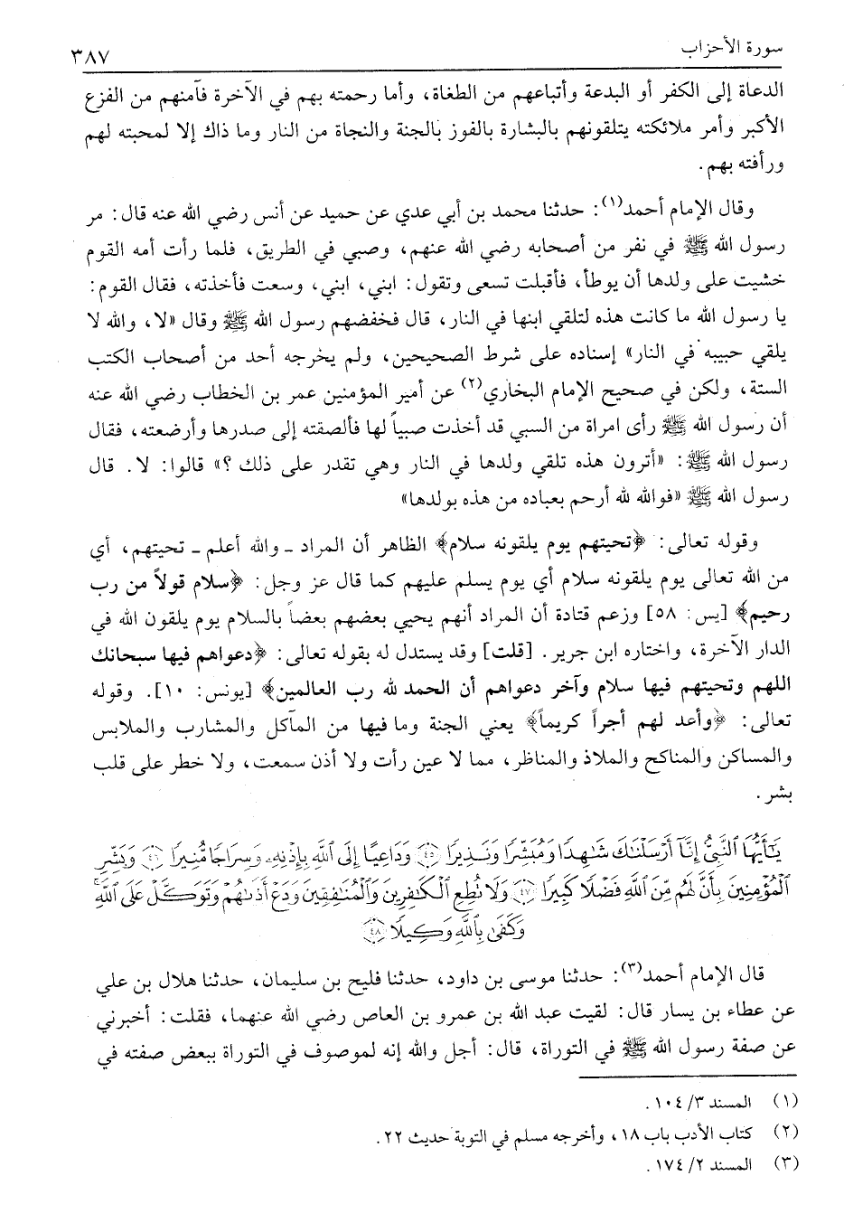 يَا أَيُّهَا النَّبِيُّ إِنَّا أَرْسَلْناكَ شاهِداً وَمُبَشِّراً وَنَذِيراً (45) وَداعِياً إِلَى اللَّهِ بِإِذْنِهِ وَسِراجاً مُنِيراً (46) وَبَشِّرِ الْمُؤْمِنِينَ بِأَنَّ لَهُمْ مِنَ اللَّهِ فَضْلاً كَبِيراً (47) وَلا تُطِعِ الْكافِرِينَ وَالْمُنافِقِينَ وَدَعْ أَذاهُمْ وَتَوَكَّلْ عَلَى اللَّهِ وَكَفى بِاللَّهِ وَكِيلاً (48)