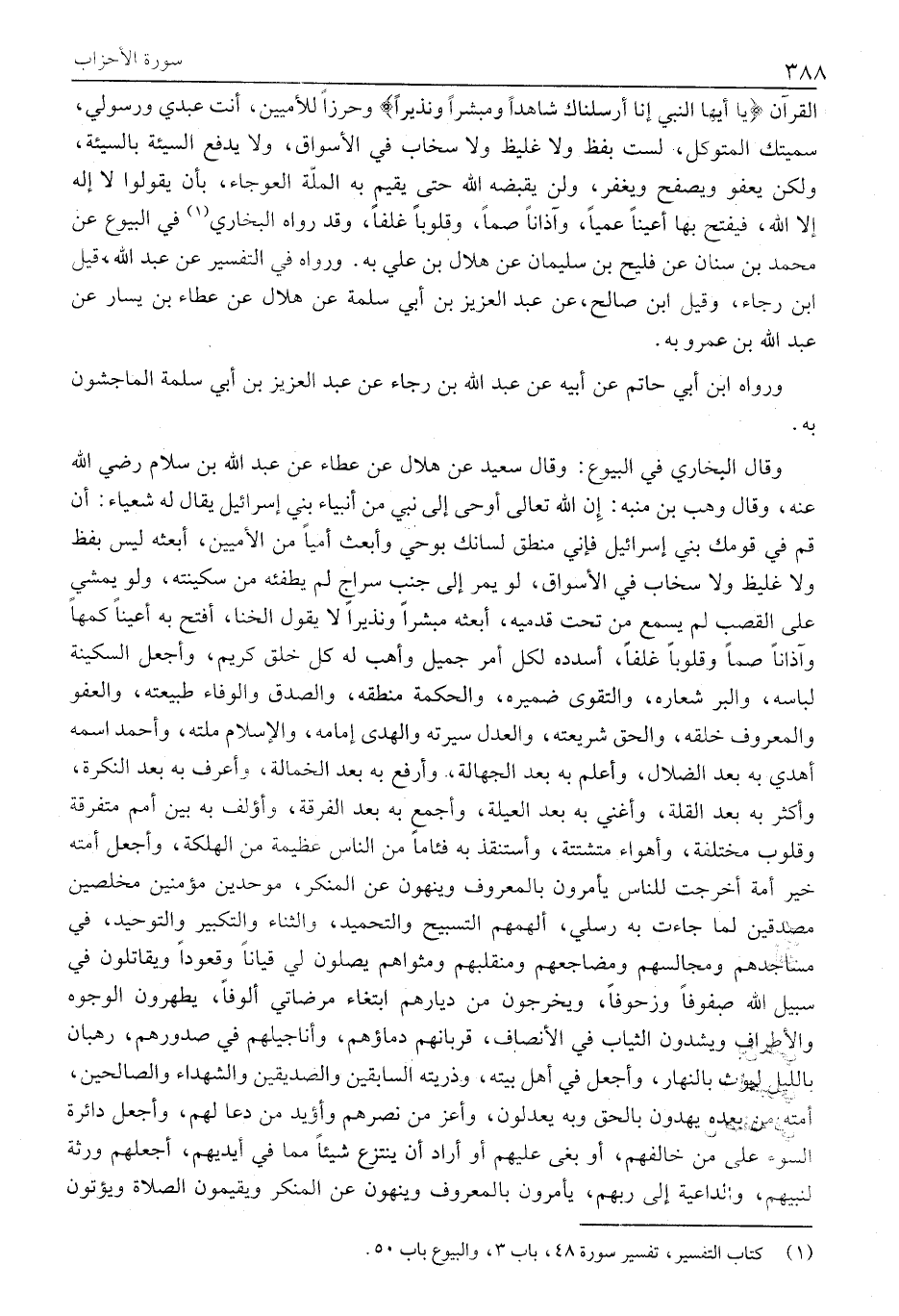 الْقُرْآنِ يَا أَيُّهَا النَّبِيُّ إِنَّا أَرْسَلْناكَ شاهِداً وَمُبَشِّراً وَنَذِيراً وَحِرْزًا لِلْأُمِّيِّينَ، أَنْتَ عَبْدِي وَرَسُولِي، سَمَّيْتُكَ الْمُتَوَكِّلَ، لَسْتَ بِفَظٍّ وَلَا غَلِيظٍ وَلَا سَخَّابٍ فِي الْأَسْوَاقِ، وَلَا يَدْفَعُ السَّيِّئَةَ بِالسَّيِّئَةِ، ولكن يعفو ويصفح وَيَغْفِرُ، وَلَنْ يَقْبِضَهُ اللَّهُ حَتَّى يُقِيمَ بِهِ الْمِلَّةَ الْعَوْجَاءَ، بِأَنْ يَقُولُوا لَا إِلَهَ إِلَّا اللَّهُ، فَيَفْتَحُ بِهَا أَعْيُنًا عُمْيًا، وَآذَانًا صُمًّا، وَقُلُوبًا غُلْفًا، وَقَدْ رَوَاهُ الْبُخَارِيُّ «1» فِي الْبُيُوعِ عَنْ مُحَمَّدِ بْنِ سِنَانٍ عَنْ فُلَيْحُ بْنُ سُلَيْمَانَ عَنْ هِلَالِ بْنِ عَلِيٍّ بِهِ. وَرَوَاهُ فِي التَّفْسِيرِ عَنْ عَبْدِ اللَّهِ، قِيلَ ابْنِ رَجَاءٍ، وَقِيلَ ابْنِ صَالِحٍ، عَنْ عَبْدِ الْعَزِيزِ بْنِ أَبِي سَلَمَةَ عَنْ هِلَالٍ عَنْ عَطَاءِ بْنِ يَسَارٍ عَنْ عَبْدِ اللَّهِ بْنِ عَمْرٍو بِهِ.