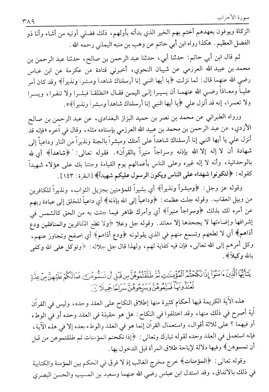 ثُمَّ قَالَ ابْنُ أَبِي حَاتِمٍ: حَدَّثَنَا أَبِي، حَدَّثَنَا عَبْدُ الرَّحْمَنِ بْنُ صَالِحٍ، حَدَّثَنَا عَبْدُ الرَّحْمَنِ بْنُ مُحَمَّدِ بْنِ عُبَيْدِ اللَّهِ الْعَرْزَمِيُّ عَنْ شَيْبَانَ النَّحْوِيِّ، أَخْبَرَنِي قَتَادَةُ عَنْ عِكْرِمَةَ عَنِ ابْنِ عَبَّاسٍ رَضِيَ اللَّهُ عَنْهُمَا قَالَ: لَمَّا نَزَلَتْ يَا أَيُّهَا النَّبِيُّ إِنَّا أَرْسَلْناكَ شاهِداً وَمُبَشِّراً وَنَذِيراً وَقَدْ كَانَ أَمَرَ عليا ومعاذا رضي الله عنهما أَنْ يَسِيرَا إِلَى الْيَمَنِ فَقَالَ «انْطَلِقَا فَبَشِّرَا وَلَا تُنَفِّرَا، وَيَسِّرَا وَلَا تُعَسِّرَا، إِنَّهُ قَدْ أُنْزِلَ عَلِيَّ يَا أَيُّهَا النَّبِيُّ إِنَّا أَرْسَلْناكَ شاهِداً وَمُبَشِّراً وَنَذِيراً» .