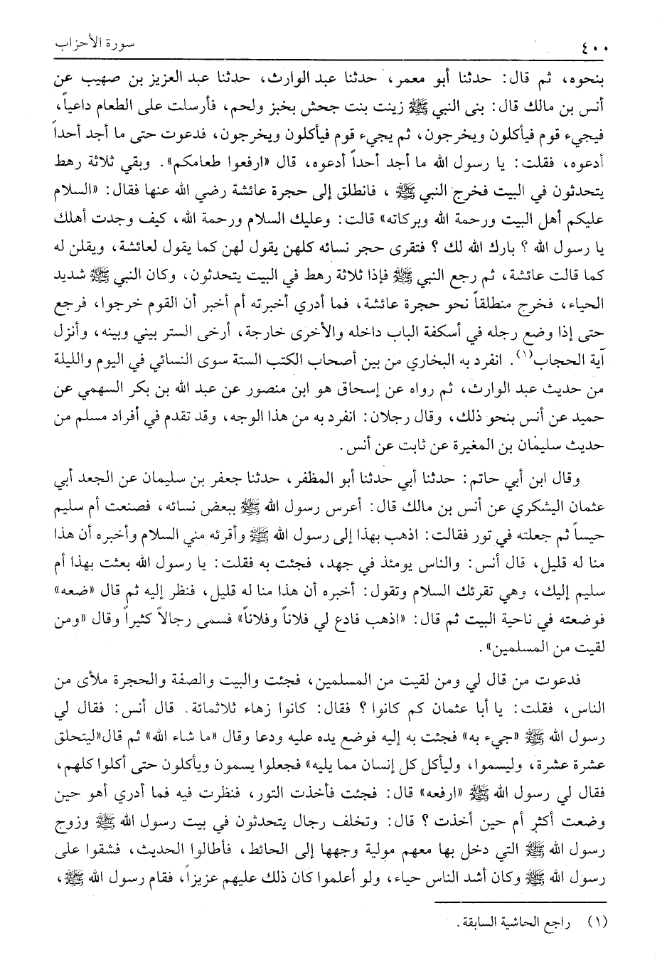 فَدَعَوْتُ مَنْ قَالَ لِي وَمَنْ لَقِيتُ مِنَ الْمُسْلِمِينَ، فَجِئْتُ وَالْبَيْتُ وَالصُّفَّةُ وَالْحُجْرَةُ مَلْأَى مِنَ النَّاسِ، فَقُلْتُ: يَا أَبَا عُثْمَانَ كَمْ كَانُوا؟ فَقَالَ: كَانُوا زُهَاءَ ثَلَاثِمِائَةٍ. قَالَ أَنَسٌ: فَقَالَ لِي رَسُولُ اللَّهِ صَلَّى اللَّهُ عَلَيْهِ وَسَلَّمَ «جيء بِهِ» فَجِئْتُ بِهِ إِلَيْهِ فَوَضَعَ يَدَهُ عَلَيْهِ وَدَعَا وَقَالَ «مَا شَاءَ اللَّهُ» ثُمَّ قَالَ «لِيَتَحَلَّقْ عَشَرَةٌ عَشَرَةٌ، وَلْيُسَمُّوا، وَلْيَأْكُلْ كُلُّ إِنْسَانٍ مِمَّا يَلِيهِ» فَجَعَلُوا يُسَمُّونَ وَيَأْكُلُونَ حَتَّى أَكَلُوا كُلُّهُمْ، فَقَالَ لِي رَسُولُ اللَّهِ صَلَّى اللَّهُ عَلَيْهِ وَسَلَّمَ «ارْفَعْهُ» قَالَ: فَجِئْتُ فَأَخَذْتُ التَّوْرَ، فنظرت فيه فَمَا أَدْرِي أَهْوَ حِينَ وَضَعْتُ أَكْثَرُ أَمْ حِينَ أَخَذْتُ؟ قَالَ: وَتَخَلَّفَ رِجَالٌ يَتَحَدَّثُونَ فِي بَيْتِ رَسُولِ اللَّهِ صَلَّى اللَّهُ عَلَيْهِ وَسَلَّمَ وَزَوْجُ رَسُولِ اللَّهِ صَلَّى اللَّهُ عَلَيْهِ وَسَلَّمَ الَّتِي دَخَلَ بِهَا مَعَهُمْ مُوَلِّيَةٌ وَجْهِهَا إِلَى الْحَائِطِ، فَأَطَالُوا الْحَدِيثَ، فَشَقُّوا عَلَى رَسُولِ اللَّهِ صَلَّى اللَّهُ عَلَيْهِ وَسَلَّمَ وَكَانَ أَشَدَّ النَّاسِ حَيَاءً، وَلَوْ أُعْلِمُوا كَانَ ذَلِكَ عَلَيْهِمْ عَزِيزًا، فَقَامَ رَسُولُ اللَّهِ صَلَّى اللَّهُ عَلَيْهِ وَسَلَّمَ،
