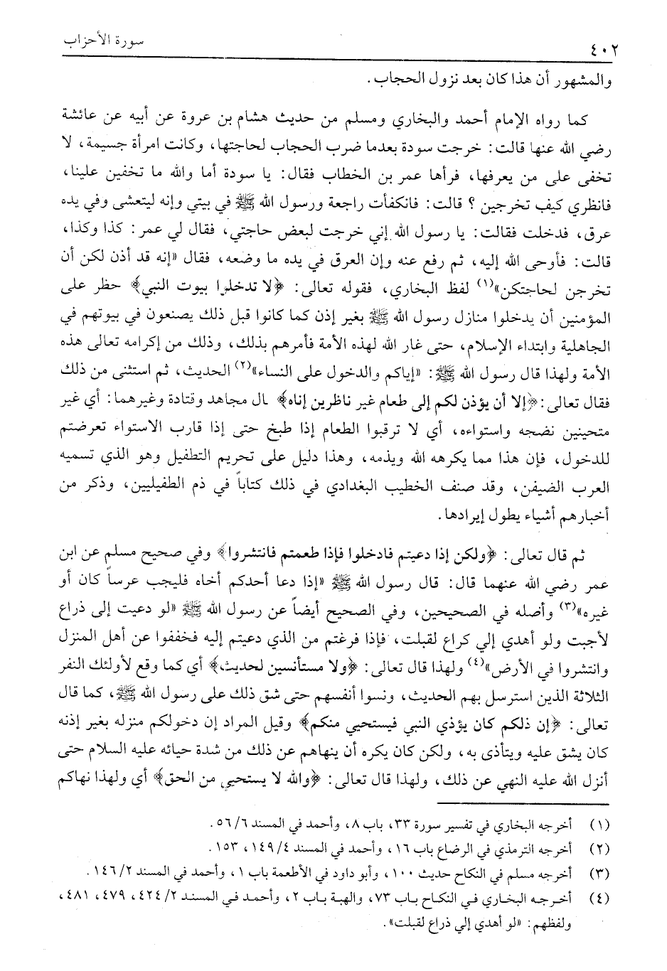 كَمَا رَوَاهُ الْإِمَامُ أَحْمَدُ وَالْبُخَارِيُّ وَمُسْلِمٌ مِنْ حَدِيثِ هِشَامِ بْنِ عُرْوَةَ عَنْ أَبِيهِ عَنْ عَائِشَةَ رَضِيَ اللَّهُ عَنْهَا قَالَتْ: خَرَجَتْ سَوْدَةُ بعد ما ضُرِبَ الْحِجَابُ لِحَاجَتِهَا، وَكَانَتِ امْرَأَةً جَسِيمَةً، لَا تَخْفَى عَلَى مَنْ يَعْرِفُهَا، فَرَآهَا عُمَرُ بْنُ الْخَطَّابِ فَقَالَ: يَا سَوْدَةُ أَمَا وَاللَّهِ مَا تَخْفَيْنَ عَلَيْنَا، فَانْظُرِي كَيْفَ تَخْرُجِينَ؟ قَالَتْ: فَانْكَفَأْتُ رَاجِعَةً وَرَسُولُ اللَّهِ صَلَّى اللَّهُ عَلَيْهِ وَسَلَّمَ فِي بَيْتِي وَإِنَّهُ لَيَتَعَشَّى وَفِي يَدِهِ عَرْقٌ، فَدَخَلَتْ فَقَالَتْ: يَا رَسُولَ اللَّهِ إِنِّي خَرَجْتُ لِبَعْضِ حَاجَتِي، فَقَالَ لِي عُمَرُ: كَذَا وَكَذَا، قَالَتْ: فَأَوْحَى اللَّهُ إِلَيْهِ، ثُمَّ رُفِعَ عَنْهُ وَإِنَّ الْعَرْقَ فِي يَدِهِ مَا وَضَعَهُ، فَقَالَ «إِنَّهُ قَدْ أُذِنَ لَكُنَّ أَنْ تَخْرُجْنَ لِحَاجَتِكُنَّ» «1» لفظ البخاري، فقوله تعالى: لَا تَدْخُلُوا بُيُوتَ النَّبِيِّ حَظَرَ عَلَى الْمُؤْمِنِينَ أَنْ يَدْخُلُوا مَنَازِلَ رَسُولُ اللَّهِ صَلَّى اللَّهُ عَلَيْهِ وَسَلَّمَ بِغَيْرِ إِذْنٍ كَمَا كَانُوا قَبْلَ ذَلِكَ يَصْنَعُونَ فِي بُيُوتِهِمْ فِي الْجَاهِلِيَّةِ وَابْتِدَاءِ الْإِسْلَامِ، حَتَّى غَارَ اللَّهُ لِهَذِهِ الْأُمَّةِ فَأَمَرَهُمْ بِذَلِكَ، وَذَلِكَ مِنْ إِكْرَامِهِ تَعَالَى هَذِهِ الْأُمَّةَ وَلِهَذَا قَالَ رَسُولُ اللَّهِ صَلَّى اللَّهُ عَلَيْهِ وَسَلَّمَ: «إياكم والدخول على النساء» «2» الحديث، ثم استثنى من ذلك فقال تعالى: إِلَّا أَنْ يُؤْذَنَ لَكُمْ إِلى طَعامٍ غَيْرَ ناظِرِينَ إِناهُ قَالَ مُجَاهِدٌ وَقَتَادَةُ وَغَيْرُهُمَا: أَيْ غَيْرَ مُتَحَيِّنِينَ نُضْجَهُ وَاسْتِوَاءَهُ، أَيْ لَا تَرْقُبُوا الطعام إذا طبخ حَتَّى إِذَا قَارَبَ الِاسْتِوَاءَ تَعَرَّضْتُمْ لِلدُّخُولِ، فَإِنَّ هذا مما يَكْرَهُهُ اللَّهُ وَيَذُمُّهُ، وَهَذَا دَلِيلٌ عَلَى تَحْرِيمِ التَّطْفِيلِ وَهُوَ الَّذِي تُسَمِّيهِ الْعَرَبُ الضَّيْفَنَ، وَقَدْ صَنَّفَ الْخَطِيبُ الْبَغْدَادِيُّ فِي ذَلِكَ كِتَابًا فِي ذَمِّ الطُّفَيْلِيِّينَ، وَذَكَرَ مِنْ أَخْبَارِهِمْ أَشْيَاءَ يَطُولُ إِيرَادُهَا.