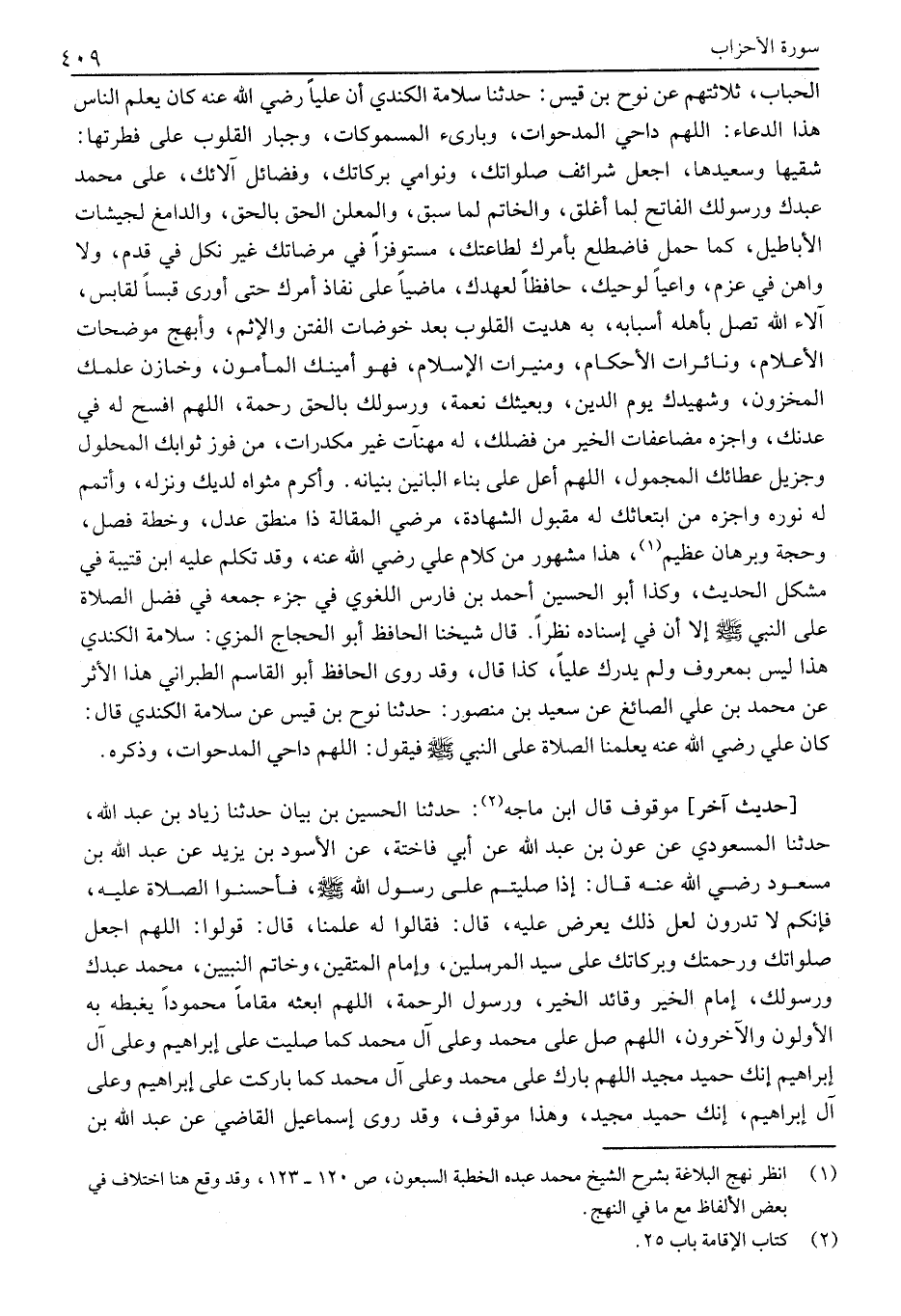 شَقِيِّهَا وسعيدها، اجعل شرائف صلواتك، ونوامي بركاتك، وفضائل آلائك، على محمد عبدك ورسولك الفاتح لما أغلق، والخاتم لما سبق، والمعلن الحق بالحق، والدامغ لجيشات الْأَبَاطِيلِ، كَمَا حُمِّلَ فَاضْطَلَعَ بِأَمْرِكَ لِطَاعَتِكَ، مُسْتَوْفِزًا فِي مَرْضَاتِكَ غَيْرَ نَكِلٍ فِي قَدَمٍ، وَلَا واهن فِي عَزْمٍ، وَاعِيًا لِوَحْيِكَ، حَافِظًا لِعَهْدِكَ، مَاضِيًا عَلَى نَفَاذِ أَمْرِكَ حَتَّى أَوْرَى قَبَسًا لِقَابِسٍ، آلَاءُ اللَّهِ تَصِلُ بِأَهْلِهِ أَسْبَابُهُ، بِهِ هُدِيَتِ القلوب بعد خوضات الفتن والإثم، وأبهج موضحات الأعلام، ونائرات الأحكام، ومنيرات الإسلام، فَهُوَ أَمِينُكَ الْمَأْمُونُ، وَخَازِنُ عِلْمِكَ الْمَخْزُونُ، وَشَهِيدُكَ يَوْمَ الدِّينِ، وَبَعِيثُكَ نِعْمَةً، وَرَسُولُكَ بِالْحَقِّ رَحْمَةً، اللهم افسح له في عدنك، واجزه مضاعفات الخير من فضلك، له مهنآت غير مكدرات، من فوز ثوابك المحلول وَجَزِيلِ عَطَائِكِ الْمَجْمُولِ، اللَّهُمَّ أَعْلِ عَلَى بِنَاءِ الْبَانِينَ بُنْيَانَهُ. وَأَكْرِمْ مَثْوَاهُ لَدَيْكَ وَنُزُلَهُ، وَأَتْمِمْ لَهُ نُورَهُ وَاجْزِهِ مِنَ ابْتِعَاثِكَ لَهُ مَقْبُولَ الشَّهَادَةِ، مَرْضِيُّ الْمُقَالَةِ ذَا مَنْطِقٍ عَدْلٍ، وَخُطَّةٍ فَصْلٍ، وَحُجَّةٍ وَبُرْهَانٍ عَظِيمٍ «1» ، هَذَا مَشْهُورٌ مِنْ كَلَامِ عَلِيٍّ رَضِيَ اللَّهُ عَنْهُ، وَقَدْ تَكَلَّمَ عَلَيْهِ ابْنُ قُتَيْبَةَ فِي مُشْكِلِ الْحَدِيثِ، وَكَذَا أَبُو الْحُسَيْنِ أَحْمَدُ بْنُ فَارِسٍ اللُّغَوِيُّ فِي جُزْءٍ جَمَعَهُ فِي فَضْلِ الصَّلَاةِ عَلَى النَّبِيِّ صَلَّى اللَّهُ عَلَيْهِ وَسَلَّمَ إِلَّا أَنَّ فِي إِسْنَادِهِ نَظَرًا. قَالَ شَيْخُنَا الْحَافِظُ أَبُو الْحَجَّاجِ الْمِزِّيُّ: سَلَامَةُ الْكِنْدِيُّ هَذَا لَيْسَ بِمَعْرُوفٍ وَلَمْ يُدْرِكْ عَلِيًّا، كَذَا قَالَ، وَقَدْ رَوَى الْحَافِظُ أَبُو الْقَاسِمِ الطَّبَرَانِيُّ هَذَا الْأَثَرَ عَنْ مُحَمَّدِ بْنِ عَلِيٍّ الصَّائِغِ عَنْ سَعِيدِ بْنِ مَنْصُورٍ: حَدَّثَنَا نُوحُ بْنُ قَيْسٍ عَنْ سَلَامَةَ الْكِنْدِيِّ قَالَ: