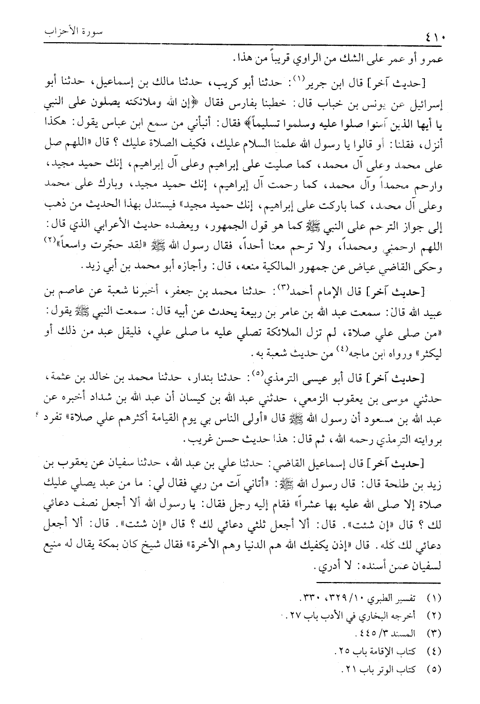 [حَدِيثٌ آخَرُ] قَالَ ابْنُ جَرِيرٍ «1» : حَدَّثَنَا أَبُو كُرَيْبٍ، حَدَّثَنَا مَالِكُ بْنُ إِسْمَاعِيلَ، حَدَّثَنَا أَبُو إِسْرَائِيلَ عَنْ يُونُسَ بْنِ خَبَّابٍ قَالَ: خَطَبْنَا بِفَارِسَ فَقَالَ إِنَّ اللَّهَ وَمَلائِكَتَهُ يُصَلُّونَ عَلَى النَّبِيِّ يَا أَيُّهَا الَّذِينَ آمَنُوا صَلُّوا عَلَيْهِ وَسَلِّمُوا تَسْلِيماً فَقَالَ: أَنْبَأَنِي مَنْ سَمِعَ ابْنَ عَبَّاسٍ يَقُولُ: هَكَذَا أُنْزِلَ، فَقُلْنَا: أَوْ قَالُوا يَا رَسُولَ اللَّهِ عَلِمْنَا السَّلَامَ عَلَيْكَ، فَكَيْفَ الصلاة عليك؟ قال «اللَّهُمَّ صِلِّ عَلَى مُحَمَّدٍ وَعَلَى آلِ مُحَمَّدٍ، كَمَا صَلَّيْتَ عَلَى إِبْرَاهِيمَ وَعَلَى آلِ إِبْرَاهِيمَ، إِنَّكَ حَمِيدٌ مَجِيدٌ، وَارْحَمْ مُحَمَّدًا وَآلَ مُحَمَّدٍ، كَمَا رَحِمْتَ آلَ إِبْرَاهِيمَ، إِنَّكَ حَمِيدٌ مَجِيدٌ، وَبَارِكْ عَلَى مُحَمَّدٍ وَعَلَى آلِ مُحَمَّدٍ، كَمَا بَارَكْتَ عَلَى إِبْرَاهِيمَ، إِنَّكَ حَمِيدٌ مَجِيدٌ» فَيَسْتَدِلُّ بِهَذَا الْحَدِيثِ مَنْ ذَهَبَ إِلَى جَوَازِ التَّرَحُّمِ عَلَى النَّبِيِّ صَلَّى اللَّهُ عَلَيْهِ وَسَلَّمَ كَمَا هُوَ قَوْلُ الْجُمْهُورِ، وَيُعَضِّدُهُ حَدِيثُ الْأَعْرَابِيِّ الَّذِي قَالَ: