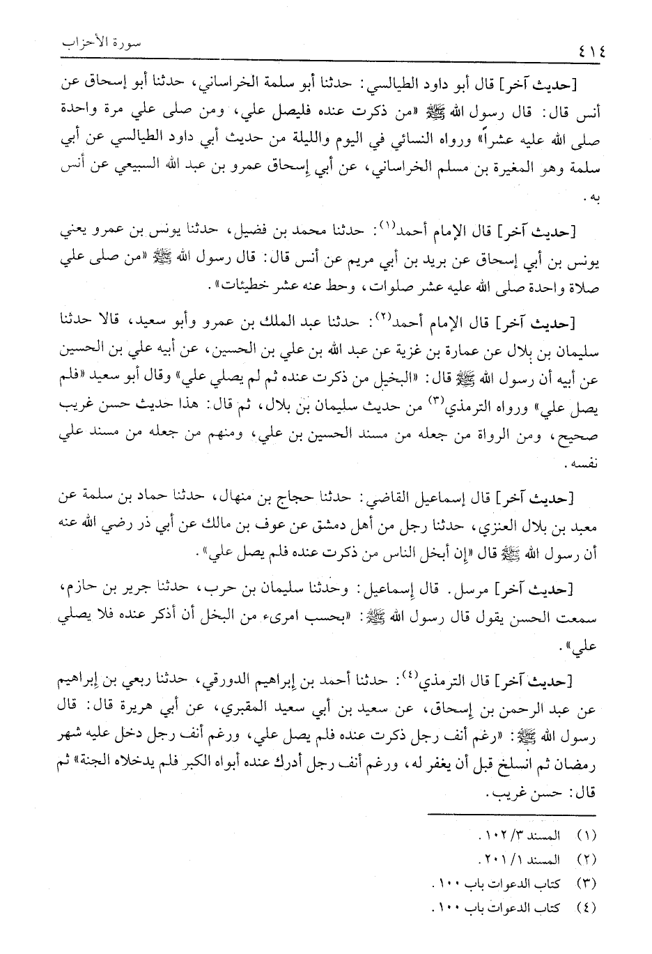 [حَدِيثٌ آخَرُ] قَالَ الْإِمَامُ أَحْمَدُ «2» : حَدَّثَنَا عَبْدُ الْمَلِكِ بْنُ عَمْرٍو وَأَبُو سَعِيدٍ، قَالَا حَدَّثَنَا سُلَيْمَانُ بْنُ بِلَالٍ عَنْ عِمَارَةَ بْنِ غَزِيَّةَ عَنْ عبد الله بن علي بْنِ الْحُسَيْنِ، عَنْ أَبِيهِ عَلِيِّ بْنِ الْحُسَيْنِ عَنْ أَبِيهِ أَنَّ رَسُولَ اللَّهِ صَلَّى اللَّهُ عَلَيْهِ وَسَلَّمَ قَالَ: «الْبَخِيلُ مَنْ ذُكِرْتُ عِنْدَهُ ثم لم يصلي عَلَيَّ» وَقَالَ أَبُو سَعِيدٍ «فَلَمْ يُصَلِّ عَلَيَّ» وَرَوَاهُ التِّرْمِذِيُّ «3» مِنْ حَدِيثِ سُلَيْمَانَ بْنِ بِلَالٍ، ثُمَّ قَالَ: هَذَا حَدِيثٌ حَسَنٌ غَرِيبٌ صَحِيحٌ، وَمِنَ الرُّوَاةِ مَنْ جَعَلَهُ مِنْ مُسْنَدِ الْحُسَيْنِ بْنِ عَلِيٍّ، وَمِنْهُمْ مَنْ جَعَلَهُ مِنْ مُسْنَدِ عَلِيٍّ نَفْسِهِ.