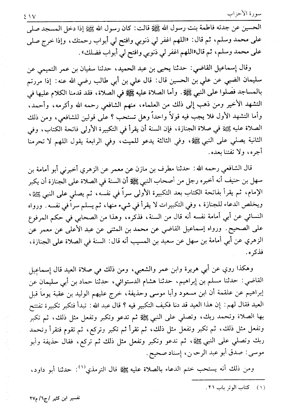 وَقَالَ إِسْمَاعِيلُ الْقَاضِي: حَدَّثَنَا يَحْيَى بْنُ عَبْدِ الْحَمِيدِ، حَدَّثَنَا سُفْيَانُ بْنُ عُمَرَ التَّمِيمِيُّ عَنْ سُلَيْمَانَ الضَّبِّيِّ عَنْ عَلِيِّ بْنِ الْحُسَيْنِ قَالَ: قَالَ عَلِيُّ بْنُ أَبِي طَالِبٍ رَضِيَ اللَّهُ عَنْهُ: إِذَا مَرَرْتُمْ بِالْمَسَاجِدِ فَصَلُّوا عَلَى النَّبِيِّ صَلَّى اللَّهُ عَلَيْهِ وَسَلَّمَ. وَأَمَّا الصلاة عليه صلى الله عليه وسلم في الصَّلَاةِ، فَقَدْ قَدَّمْنَا الْكَلَامَ عَلَيْهَا فِي التَّشَهُّدِ الْأَخِيرِ وَمَنْ ذَهَبَ إِلَى ذَلِكَ مِنَ الْعُلَمَاءِ، منهم الشافعي رحمه الله وأكرمه، وأحمد، وأما التشهد الأول فلا يجب فِيهِ قَوْلًا وَاحِدًا وَهَلْ تُسْتَحَبُّ؟ عَلَى قَوْلَيْنِ لِلشَّافِعِيِّ، وَمِنْ ذَلِكَ الصَّلَاةُ عَلَيْهِ صَلَّى اللَّهُ عَلَيْهِ وَسَلَّمَ فِي صَلَاةِ الْجِنَازَةِ، فَإِنَّ السُّنَّةَ أَنْ يَقْرَأَ فِي التَّكْبِيرَةِ الْأُولَى فَاتِحَةَ الْكِتَابِ، وفي الثانية يصلي على النبي صلى الله عليه وسلم، وَفِي الثَّالِثَةِ يَدْعُو لِلْمَيِّتِ، وَفِي الرَّابِعَةِ يَقُولُ اللَّهُمَّ لَا تَحْرِمْنَا أَجْرَهُ، وَلَا تَفْتِنَا بَعْدَهُ.