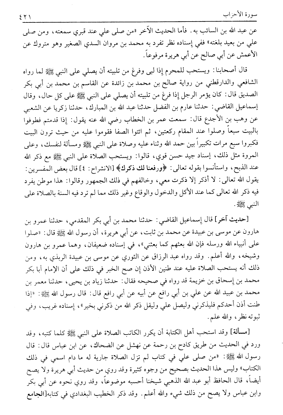 [مَسْأَلَةٌ] وَقَدْ اسْتَحَبَّ أَهْلُ الْكِتَابَةِ أَنْ يُكَرِّرَ الْكَاتِبُ الصَّلَاةَ عَلَى النَّبِيِّ صَلَّى اللَّهُ عَلَيْهِ وَسَلَّمَ كُلَّمَا كَتَبَهُ، وَقَدْ وَرَدَ فِي الْحَدِيثِ مِنْ طَرِيقِ كَادِحِ بْنِ رَحْمَةَ عَنْ نَهْشَلٍ عَنِ الضَّحَّاكِ، عَنِ ابْنِ عَبَّاسٍ قَالَ: قَالَ رَسُولُ اللَّهِ صلى الله عليه وسلم: «من صَلَّى عَلَيَّ فِي كِتَابٍ لَمْ تَزَلِ الصَّلَاةُ جَارِيَةً لَهُ مَا دَامَ اسْمِي فِي ذَلِكَ الْكِتَابِ» وَلَيْسَ هَذَا الْحَدِيثُ بِصَحِيحٍ مِنْ وُجُوهٍ كَثِيرَةٍ وَقَدْ رُوِيَ مِنْ حَدِيثِ أَبِي هُرَيْرَةَ وَلَا يَصِحُّ أَيْضًا، قَالَ الْحَافِظُ أَبُو عَبْدِ اللَّهِ الذَّهَبِيُّ شَيْخُنَا أَحْسَبُهُ مَوْضُوعًا، وَقَدْ رُوِيَ نَحْوُهُ عَنْ أَبِي بَكْرٍ وَابْنِ عَبَّاسٍ وَلَا يَصِحُّ مِنْ ذَلِكَ شَيْءٌ وَاللَّهُ أَعْلَمُ. وَقَدْ ذَكَرَ الْخَطِيبُ الْبَغْدَادِيُّ فِي كِتَابِهِ [الْجَامِعُ