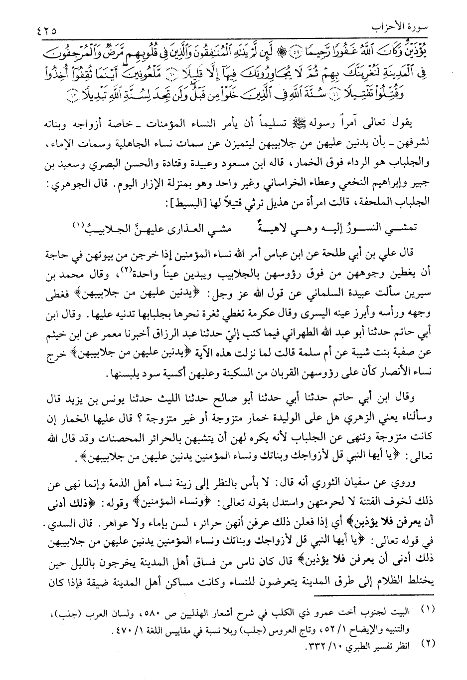 يَقُولُ تَعَالَى آمِرًا رَسُولَهُ صَلَّى اللَّهُ عَلَيْهِ وَسَلَّمَ تَسْلِيمًا أَنْ يَأْمُرَ النِّسَاءَ الْمُؤْمِنَاتِ- خَاصَّةً أَزْوَاجَهُ وَبَنَاتِهِ لِشَرَفِهِنَّ- بِأَنْ يُدْنِينَ عَلَيْهِنَّ مِنْ جَلَابِيبِهِنَّ لِيَتَمَيَّزْنَ عَنْ سِمَاتِ نِسَاءِ الْجَاهِلِيَّةِ وَسِمَاتِ الْإِمَاءِ، وَالْجِلْبَابُ هُوَ الرِّدَاءُ فَوْقَ الْخِمَارِ، قَالَهُ ابْنُ مَسْعُودٍ وَعُبَيْدَةُ وَقَتَادَةُ وَالْحَسَنُ الْبَصْرِيُّ وَسَعِيدُ بْنُ جُبَيْرٍ وَإِبْرَاهِيمُ النَّخَعِيُّ وَعَطَاءٌ الْخُرَاسَانِيُّ وَغَيْرُ وَاحِدٍ وَهُوَ بِمَنْزِلَةِ الْإِزَارِ اليوم. قال الْجَوْهَرِيُّ: