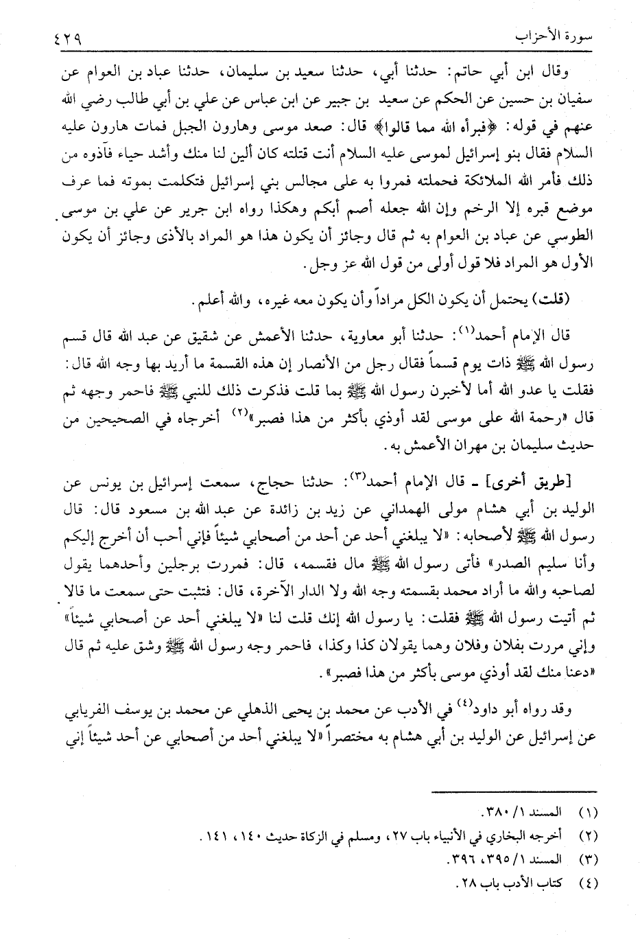 [طَرِيقٌ أُخْرَى]- قَالَ الْإِمَامُ أَحْمَدُ «3» : حَدَّثَنَا حَجَّاجٌ، سَمِعْتُ إِسْرَائِيلَ بْنَ يُونُسَ عَنِ الْوَلِيدِ بْنِ أَبِي هِشَامٍ مَوْلَى الْهَمْدَانِيِّ عَنْ زَيْدِ بْنِ زائدة عَنْ عَبْدِ اللَّهِ بْنِ مَسْعُودٍ قَالَ: قَالَ رَسُولُ اللَّهِ صَلَّى اللَّهُ عَلَيْهِ وَسَلَّمَ لِأَصْحَابِهِ: «لا يبلغني أحد عن أحد من أصحابي شَيْئًا فَإِنِّي أُحِبُّ أَنْ أَخْرُجَ إِلَيْكُمْ وَأَنَا سَلِيمُ الصَّدْرِ» فَأَتَى رَسُولَ اللَّهِ صَلَّى اللَّهُ عَلَيْهِ وَسَلَّمَ مَالٌ فَقَسَمَهُ، قَالَ: فَمَرَرْتُ بِرَجُلَيْنِ وَأَحَدُهُمَا يَقُولُ لِصَاحِبِهِ وَاللَّهِ مَا أَرَادَ مُحَمَّدٌ بِقِسْمَتِهِ وَجْهَ اللَّهِ وَلَا الدَّارَ الْآخِرَةَ، قَالَ: فتثبت حَتَّى سَمِعْتُ مَا قَالَا ثُمَّ أَتَيْتُ رَسُولَ اللَّهِ صَلَّى اللَّهُ عَلَيْهِ وَسَلَّمَ فقلت: يا رَسُولَ اللَّهِ إِنَّكَ قُلْتَ لَنَا «لَا يُبَلِّغُنِي أَحَدٌ عَنْ أَصْحَابِي شَيْئًا» وَإِنِّي مَرَرْتُ بِفُلَانٍ وَفُلَانٍ وَهُمَا يَقُولَانِ كَذَا وَكَذَا، فَاحْمَرَّ وَجْهُ رَسُولِ اللَّهِ صَلَّى اللَّهُ عَلَيْهِ وَسَلَّمَ وَشَقَّ عَلَيْهِ ثُمَّ قَالَ «دَعْنَا مِنْكَ لَقَدْ أُوذِيَ مُوسَى بِأَكْثَرِ مِنْ هَذَا فَصَبَرَ» .
