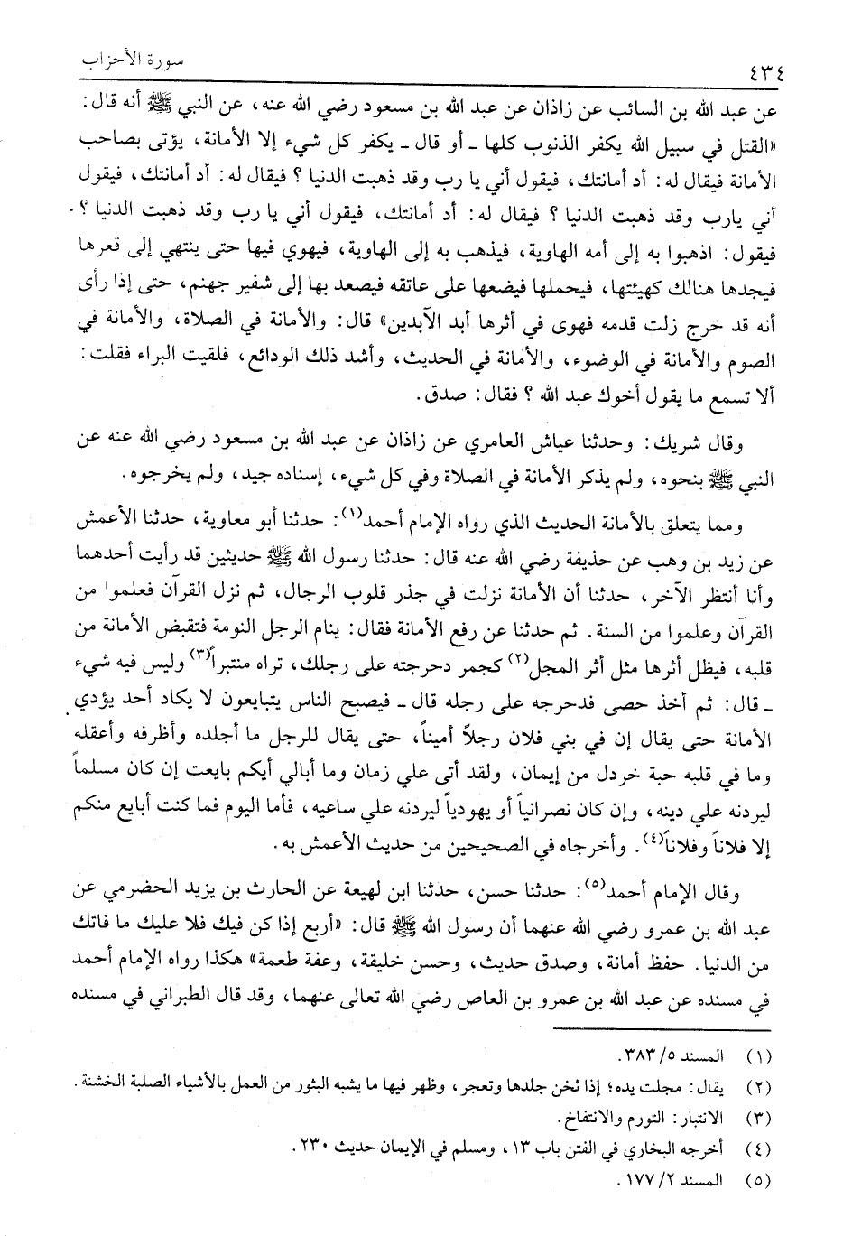 وَمِمَّا يَتَعَلَّقُ بِالْأَمَانَةِ الْحَدِيثُ الَّذِي رَوَاهُ الْإِمَامُ أَحْمَدُ «1» : حَدَّثَنَا أَبُو مُعَاوِيَةَ، حَدَّثَنَا الْأَعْمَشُ عَنْ زَيْدِ بْنِ وَهْبٍ عَنْ حذيفة رَضِيَ اللَّهُ عَنْهُ قَالَ: حَدَّثَنَا رَسُولُ اللَّهِ صَلَّى اللَّهُ عَلَيْهِ وَسَلَّمَ حَدِيثَيْنَ قَدْ رَأَيْتُ أَحَدَهُمَا وَأَنَا أَنْتَظِرُ الْآخَرَ، حَدَّثَنَا أَنَّ الْأَمَانَةَ نَزَلَتْ فِي جِذْرِ قُلُوبِ الرِّجَالِ، ثُمَّ نَزَلَ الْقُرْآنُ فَعَلِمُوا مِنَ الْقُرْآنِ وَعَلِمُوا مِنَ السُّنَّةِ. ثُمَّ حَدَّثَنَا عَنْ رَفْعِ الْأَمَانَةِ فَقَالَ: يَنَامُ الرَّجُلُ النَّوْمَةَ فَتُقْبَضُ الْأَمَانَةُ مِنْ قَلْبِهِ، فَيَظَلُّ أَثَرُهَا مِثْلَ أَثَرِ الْمَجْلِ «2» كَجَمْرٍ دَحْرَجْتُهُ عَلَى رِجْلِكَ، تَرَاهُ مُنْتَبِرًا «3» وَلَيْسَ فِيهِ شَيْءٌ- قَالَ: ثُمَّ أَخَذَ حَصًى فَدَحْرَجَهُ عَلَى رِجْلِهِ قَالَ- فَيُصْبِحُ النَّاسُ يَتَبَايَعُونَ لَا يَكَادُ أَحَدٌ يُؤَدِّي الْأَمَانَةَ حَتَّى يُقَالَ إِنْ فِي بَنِي فُلَانٍ رَجُلًا أَمِينًا، حَتَّى يُقَالَ لِلرَّجُلِ مَا أَجْلَدَهُ وَأَظْرَفَهُ وَأَعْقَلَهُ وَمَا في قلبه حبة خَرْدَلٍ مِنْ إِيمَانٍ، وَلَقَدْ أَتَى عَلَيَّ زَمَانٌ وَمَا أُبَالِي أَيُّكُمْ بَايَعْتُ إِنْ كَانَ مُسْلِمًا لَيُرَدَنَّهُ عَلَيَّ دِينُهُ، وَإِنْ كَانَ نَصْرَانِيًّا أَوْ يَهُودِيًّا لَيَرُدُنَّهُ عَلِيَّ سَاعِيهِ، فَأَمَّا الْيَوْمُ فَمَا كُنْتُ أُبَايِعُ مِنْكُمْ إِلَّا فُلَانًا وَفُلَانًا «4» . وَأَخْرَجَاهُ فِي الصَّحِيحَيْنِ مِنْ حَدِيثِ الْأَعْمَشِ بِهِ.