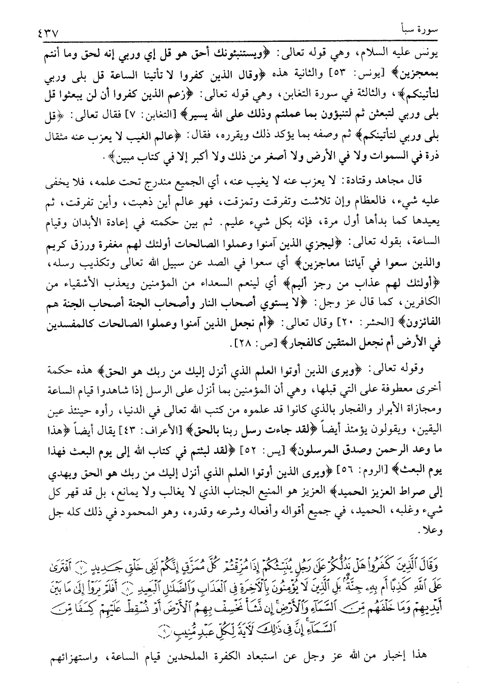 يونس عليه السلام، وهي قوله تعالى: وَيَسْتَنْبِئُونَكَ أَحَقٌّ هُوَ قُلْ إِي وَرَبِّي إِنَّهُ لَحَقٌّ وَما أَنْتُمْ بِمُعْجِزِينَ [يُونُسَ: 53] وَالثَّانِيَةُ هَذِهِ وَقالَ الَّذِينَ كَفَرُوا لَا تَأْتِينَا السَّاعَةُ قُلْ بَلى وَرَبِّي لَتَأْتِيَنَّكُمْ، والثالثة في سورة التغابن، وهي قوله تعالى: زَعَمَ الَّذِينَ كَفَرُوا أَنْ لَنْ يُبْعَثُوا قُلْ بَلى وَرَبِّي لَتُبْعَثُنَّ ثُمَّ لَتُنَبَّؤُنَّ بِما عَمِلْتُمْ وَذلِكَ عَلَى اللَّهِ يَسِيرٌ [التغابن: 7] فقال تعالى: قُلْ بَلى وَرَبِّي لَتَأْتِيَنَّكُمْ ثُمَّ وَصَفَهُ بِمَا يؤكد ذلك ويقرره، فقال: عالِمِ الْغَيْبِ لَا يَعْزُبُ عَنْهُ مِثْقالُ ذَرَّةٍ فِي السَّماواتِ وَلا فِي الْأَرْضِ وَلا أَصْغَرُ مِنْ ذلِكَ وَلا أَكْبَرُ إِلَّا فِي كِتابٍ مُبِينٍ.