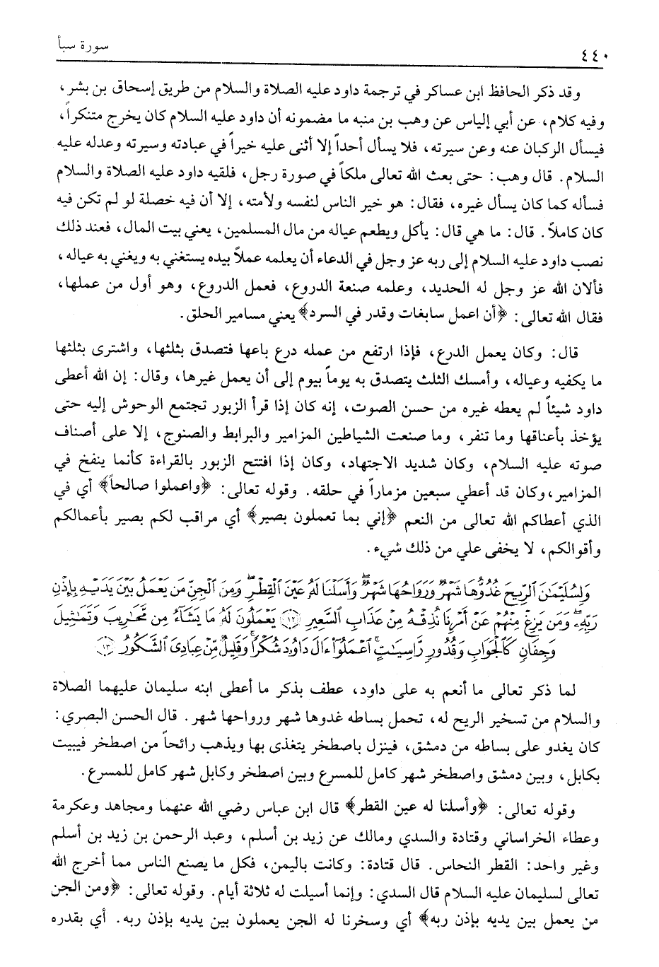 وَلِسُلَيْمانَ الرِّيحَ غُدُوُّها شَهْرٌ وَرَواحُها شَهْرٌ وَأَسَلْنا لَهُ عَيْنَ الْقِطْرِ وَمِنَ الْجِنِّ مَنْ يَعْمَلُ بَيْنَ يَدَيْهِ بِإِذْنِ رَبِّهِ وَمَنْ يَزِغْ مِنْهُمْ عَنْ أَمْرِنا نُذِقْهُ مِنْ عَذابِ السَّعِيرِ (12) يَعْمَلُونَ لَهُ مَا يَشاءُ مِنْ مَحارِيبَ وَتَماثِيلَ وَجِفانٍ كَالْجَوابِ وَقُدُورٍ راسِياتٍ اعْمَلُوا آلَ داوُدَ شُكْراً وَقَلِيلٌ مِنْ عِبادِيَ الشَّكُورُ (13)
