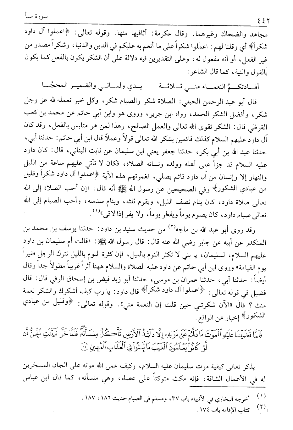 وَقَدْ رَوَى أَبُو عَبْدِ اللَّهِ بْنُ مَاجَهْ «2» مِنْ حَدِيثِ سُنَيْدِ بْنِ دَاوُدَ: حَدَّثَنَا يُوسُفُ بْنُ مُحَمَّدِ بْنِ المنكدر عن أبيه عن جَابِرٍ رَضِيَ اللَّهُ عَنْهُ قَالَ: قَالَ رَسُولُ اللَّهِ صَلَّى اللَّهُ عَلَيْهِ وَسَلَّمَ: «قَالَتْ أُمُّ سُلَيْمَانَ بن داود عليهم السلام، لِسُلَيْمَانَ، يَا بُنَيَّ لَا تُكْثِرِ النَّوْمَ بِاللَّيْلِ، فَإِنَّ كَثْرَةَ النَّوْمِ بِاللَّيْلِ تَتْرُكُ الرَّجُلَ فَقِيرًا يَوْمَ الْقِيَامَةِ» وَرَوَى ابْنُ أَبِي حَاتِمٍ عَنْ داود عليه الصلاة والسلام هَاهُنَا أَثَرًا غَرِيبًا مُطَوَّلًا جِدًّا وَقَالَ أَيْضًا: حَدَّثَنَا أَبِي، حَدَّثَنَا عِمْرَانُ بْنُ مُوسَى، حَدَّثَنَا أبو زيد فَيْضُ بْنُ إِسْحَاقَ الرَّقِّيُّ قَالَ: قَالَ فَضِيلٌ فِي قَوْلِهِ تَعَالَى: اعْمَلُوا آلَ داوُدَ شُكْراً قال دَاوُدُ: يَا رَبِّ كَيْفَ أَشْكُرُكَ وَالشُّكْرُ نِعْمَةٌ منك؟ قال «الآن شكرتني حين قلت إن النعمة مني» . وقوله تعالى: وَقَلِيلٌ مِنْ عِبادِيَ الشَّكُورُ إِخْبَارٌ عَنِ الْوَاقِعِ.